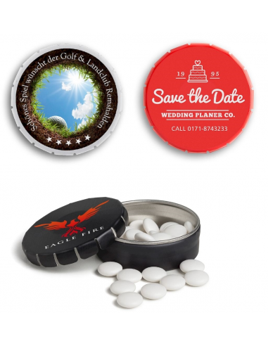 Boîte en métal à bonbons, 9 garnitures disponibles : menthe naturelle, menthe extra forte sans sucre, menthe sans sucre, chocolat, fruits assortis, cannelle, menthe forte sans sucre, fraise en forme de cœur, citron menthe.