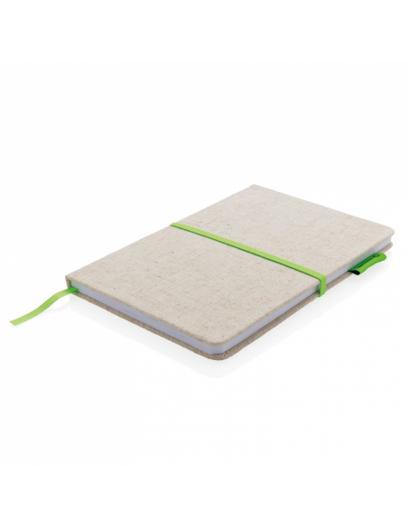 Carnet de notes à couverture en jute de 80 feuilles/160 pages de 70g/m² en papier de bambou (papier crème), élastique et ruban marque-page.