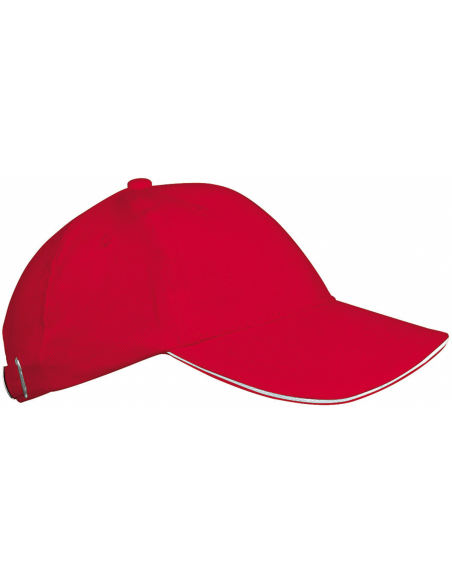 Casquette 6 panneaux. Visière préformée. Tranche de la visière de couleur contrastée. Fermeture arrière réglable par boucle métallique argent mat + passant.