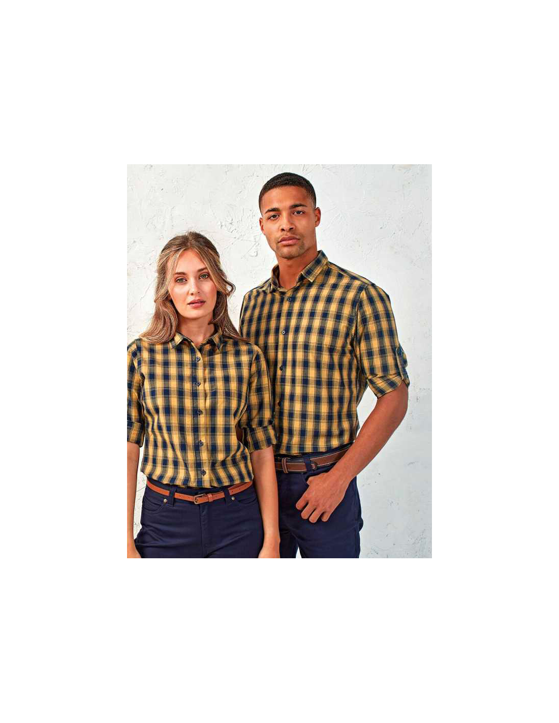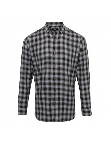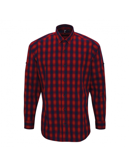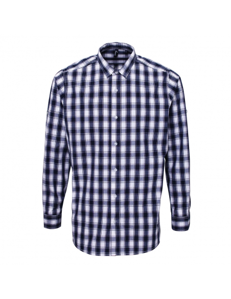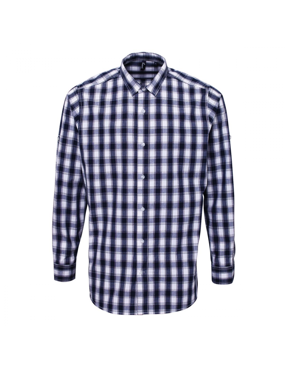 Chemise semi-cintrée à manches longues pour homme, motif à carreaux contrastés multicolores. Poignets à un seul bouton et languette dans la manche pour la maintenir en place au moyen d'un bouton sur le haut du bras. Col souple à bords arrondis.