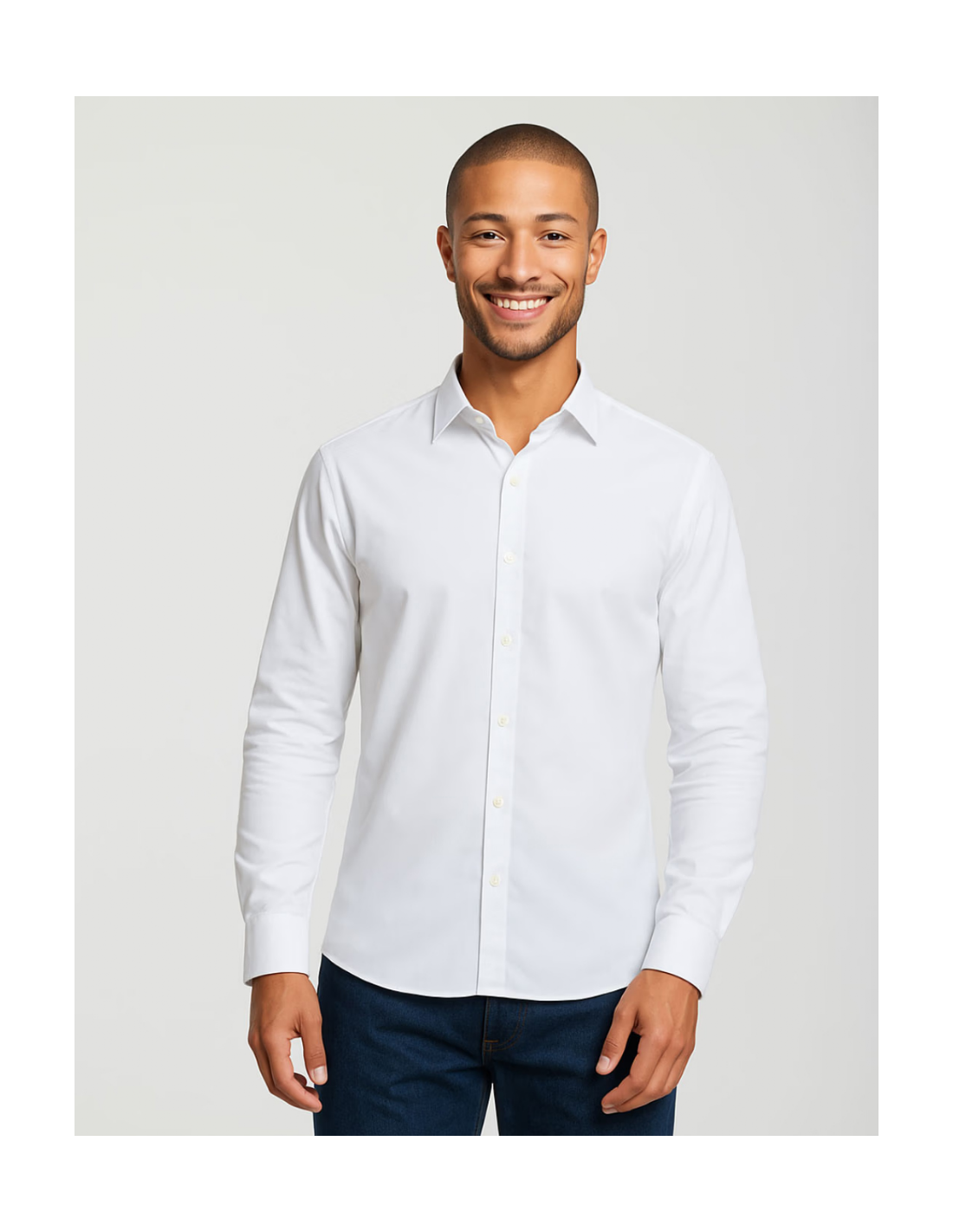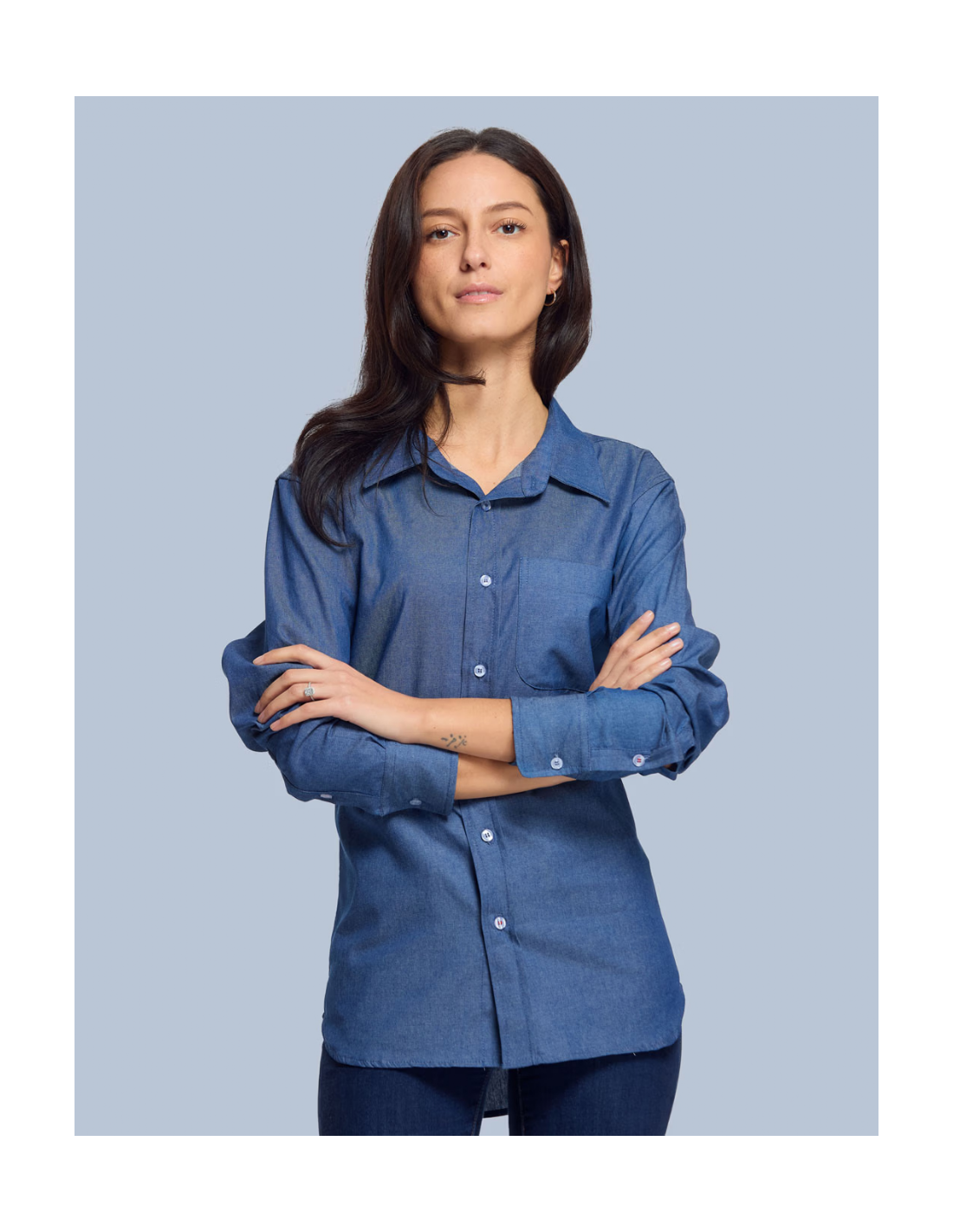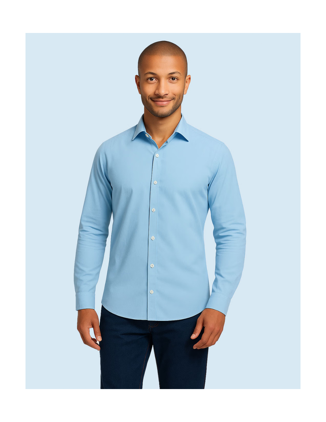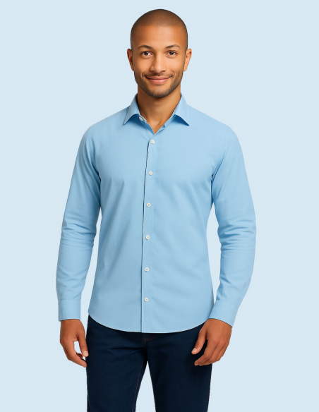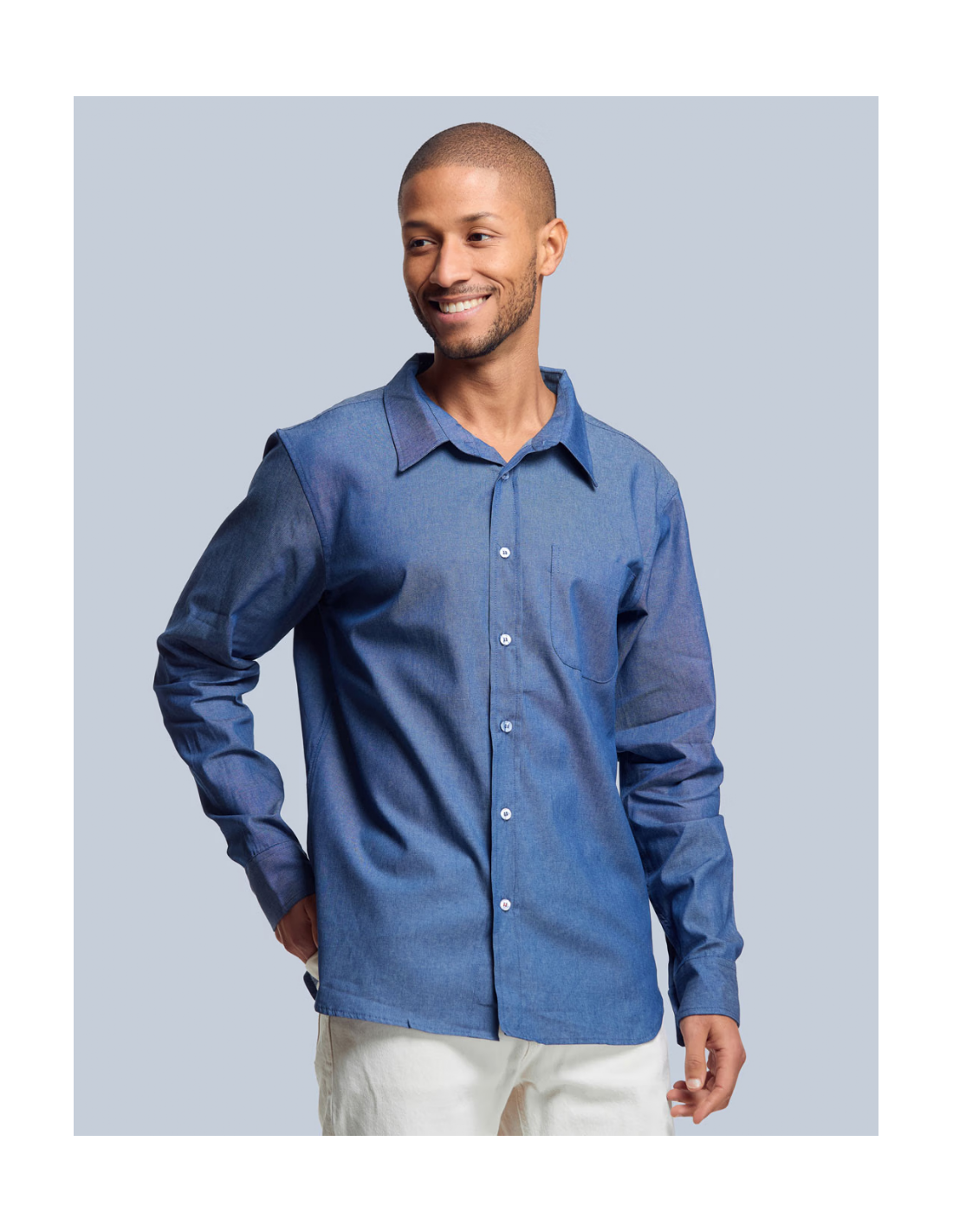 Chemise manches longues Made in France. Fabrication dans l'Oise. Coupe ajustée. Poche plaquée côté cœur uniquement sur la version bleu (denim) en chambrai de coton. La chemise présente un détail tricolore sur la couture latérale gauche en bas. Une confection 100% française et idéale pour ceux qui sont à la recherche d'une chemise confortable, durable et responsable.