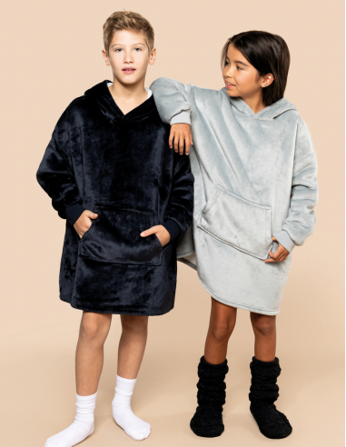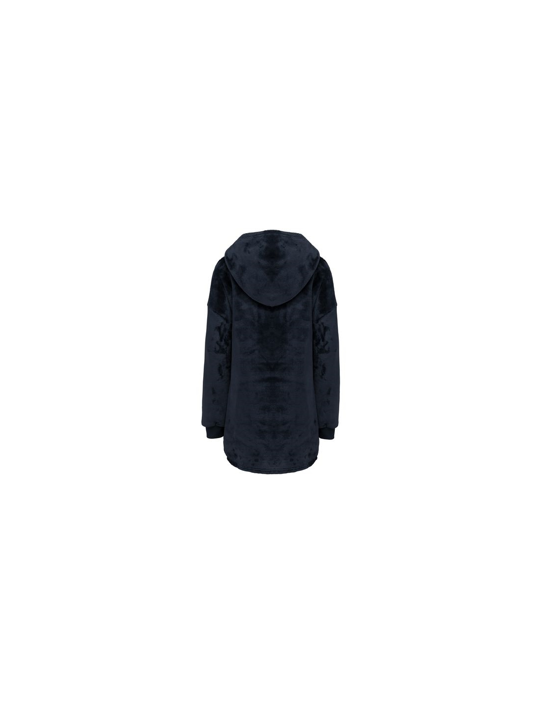 Coupe oversize aux épaules tombantes. Tissu double face, extérieur velours avec intérieur sherpa. Capuche croisée devant en deux panneaux avec finitions double surpiqûre. Manches longues avec poignet bord côte 1x1 doublé en finition tubulaire pour une meilleure finition. Présence d'élasthanne dans le bord côte bas de manche pour éviter que le poignet se déforme. Poche kangourou. Finition bas de vêtement double surpiqûre. Pas d'étiquette de marque au col, uniquement une puce de taille déchirable pour faciliter la personnalisation.