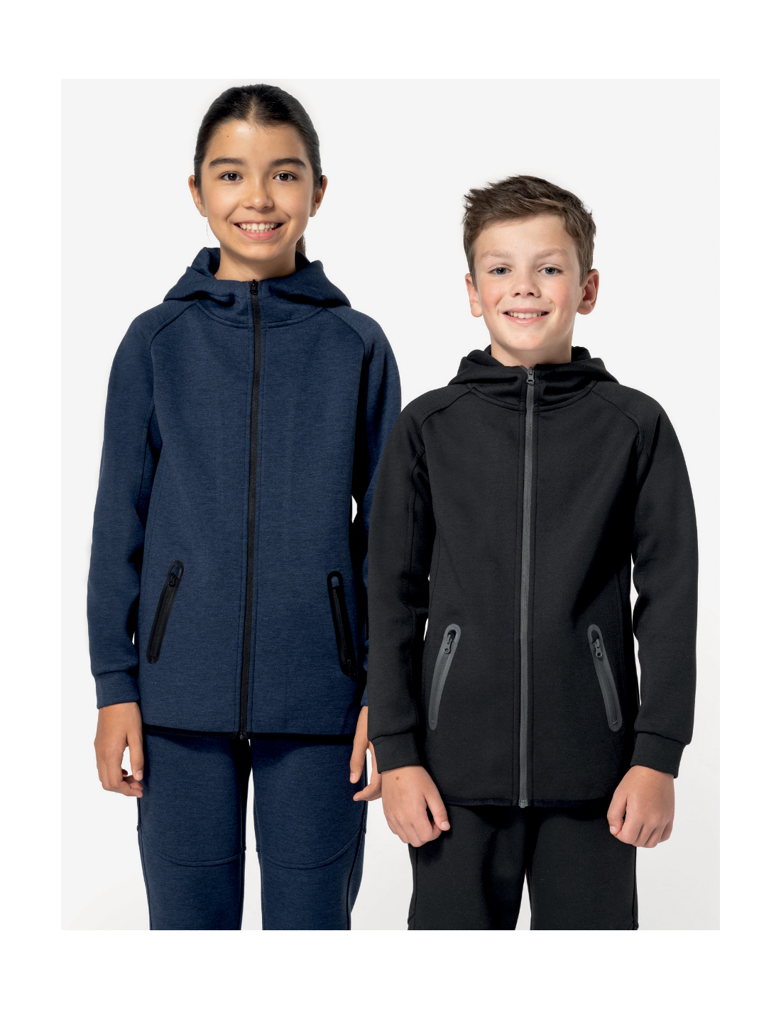 Coupe droite. Matière ultra confortable. Fermeture zippée. 2 poches avant zippées avec finition thermosoudée. Capuche doublée en jersey (65% polyester / 35% viscose). Bas de manches resserrés avec une partie élastiquée contrastée et bas de vêtement finition biais contrasté. Fermeture contrastée. Parties contrastées Black sur tous les coloris et Dark Grey sur le Ash Heather.