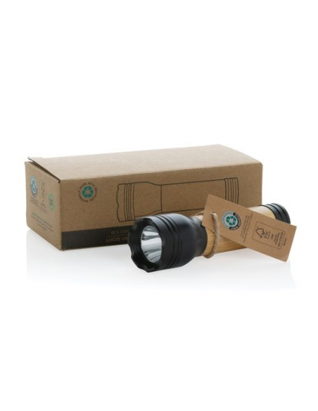 Lampe torche 1W rechargeable par USB, fabriquée avec du bambou FSC® 100% et de l'ABS recyclé certifié RCS (Recycled Claim Standard). Contenu recyclé total : 23 % sur la base du poids total de l'article. La certification RCS garantit une chaîne d'approvisionnement entièrement certifiée pour les matériaux recyclés. La torche est livrée avec une batterie au lithium de grade-a de 500 mAh. La torche peut fonctionner jusqu'à 3 heures avec une seule charge et être rechargée via le type C en 2,5 heures. La distance du faisceau est de 50 mètres et fournit 90 lumens. Avec 3 modes (lumineux, moyen et flash). Câble de recharge en TPE recyclé certifié RCS inclus. Emballée dans un emballage kraft FSC® mix. Article et accessoires 100% sans PVC.