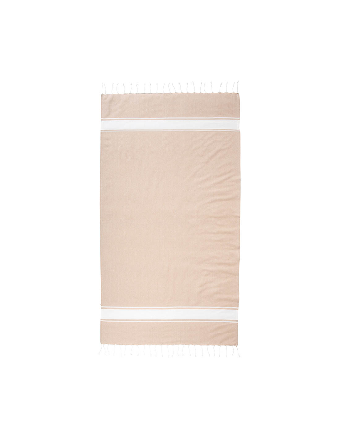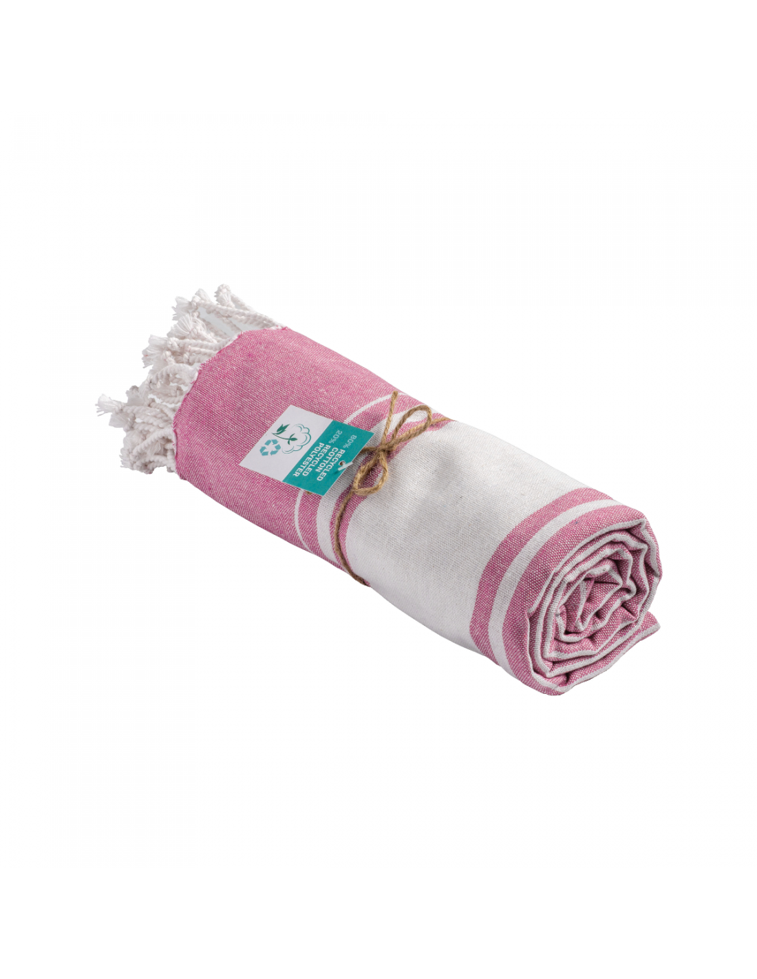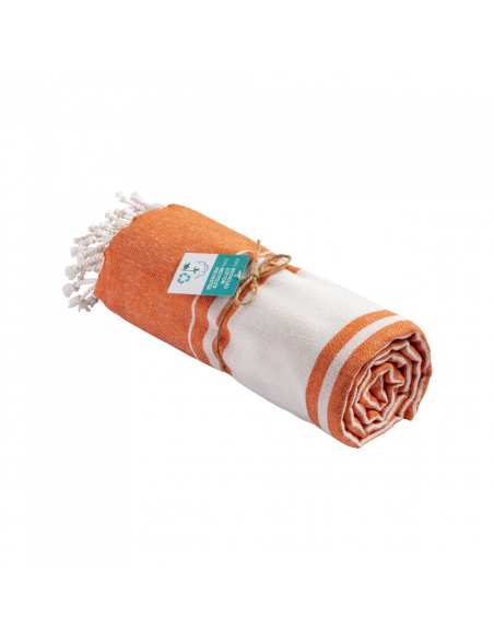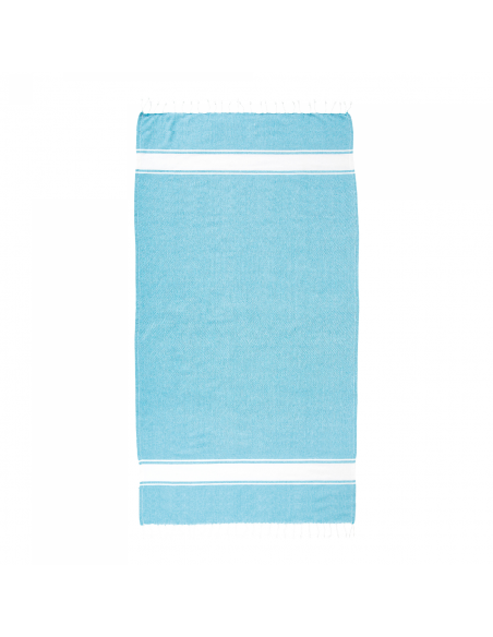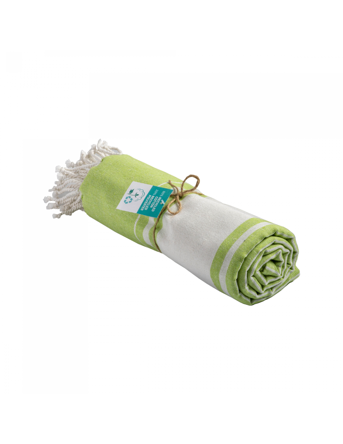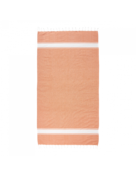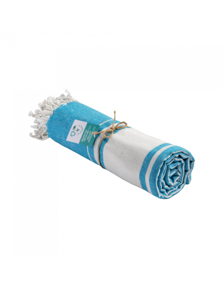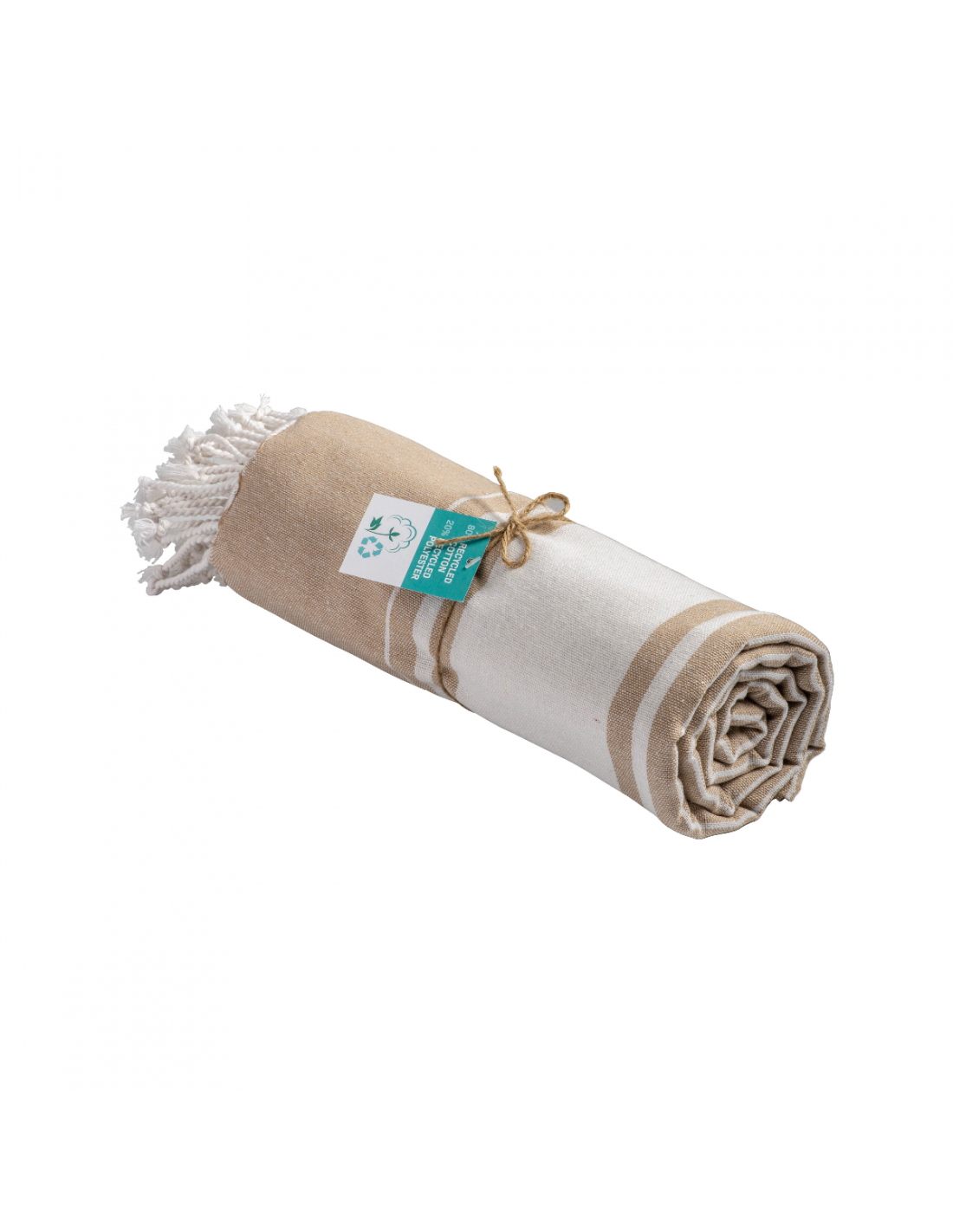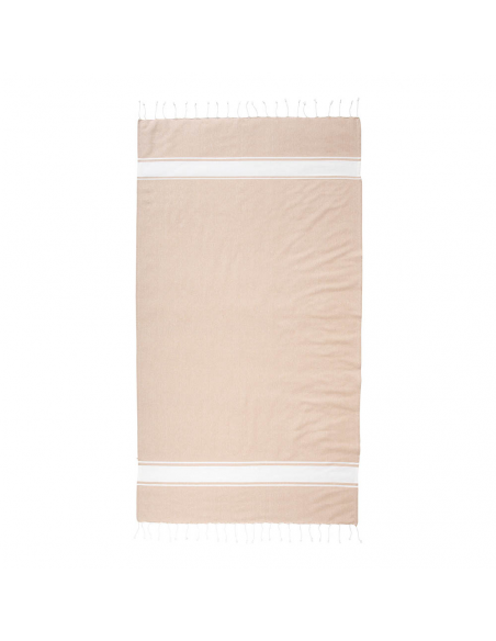 Serviette de plage en coton recyclé de 150 g/m² avec effet de mélange, deux bandes latérales et des franges. Elle est certifiée GRS (Global Recycled Standard).