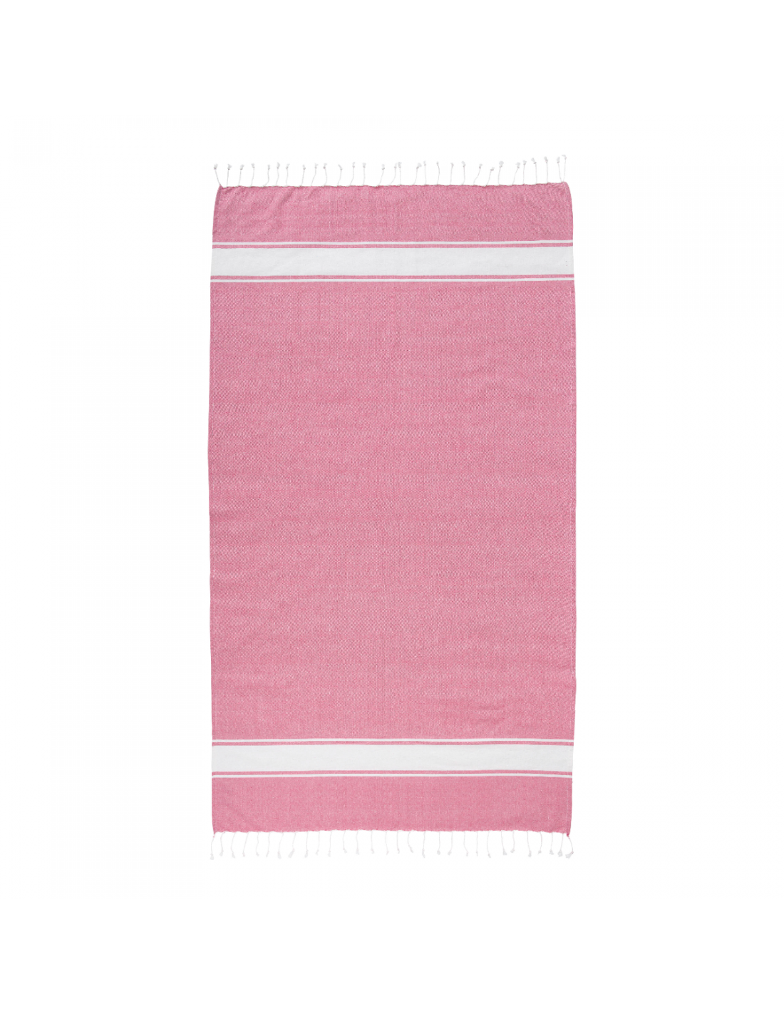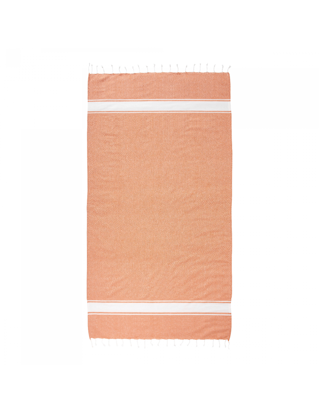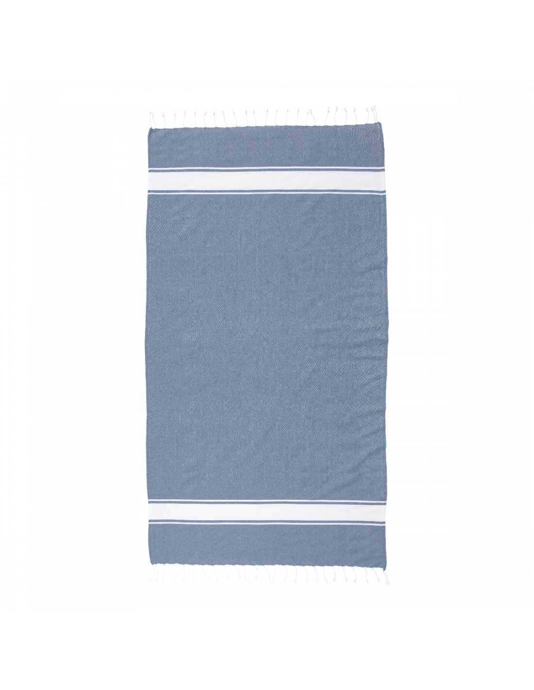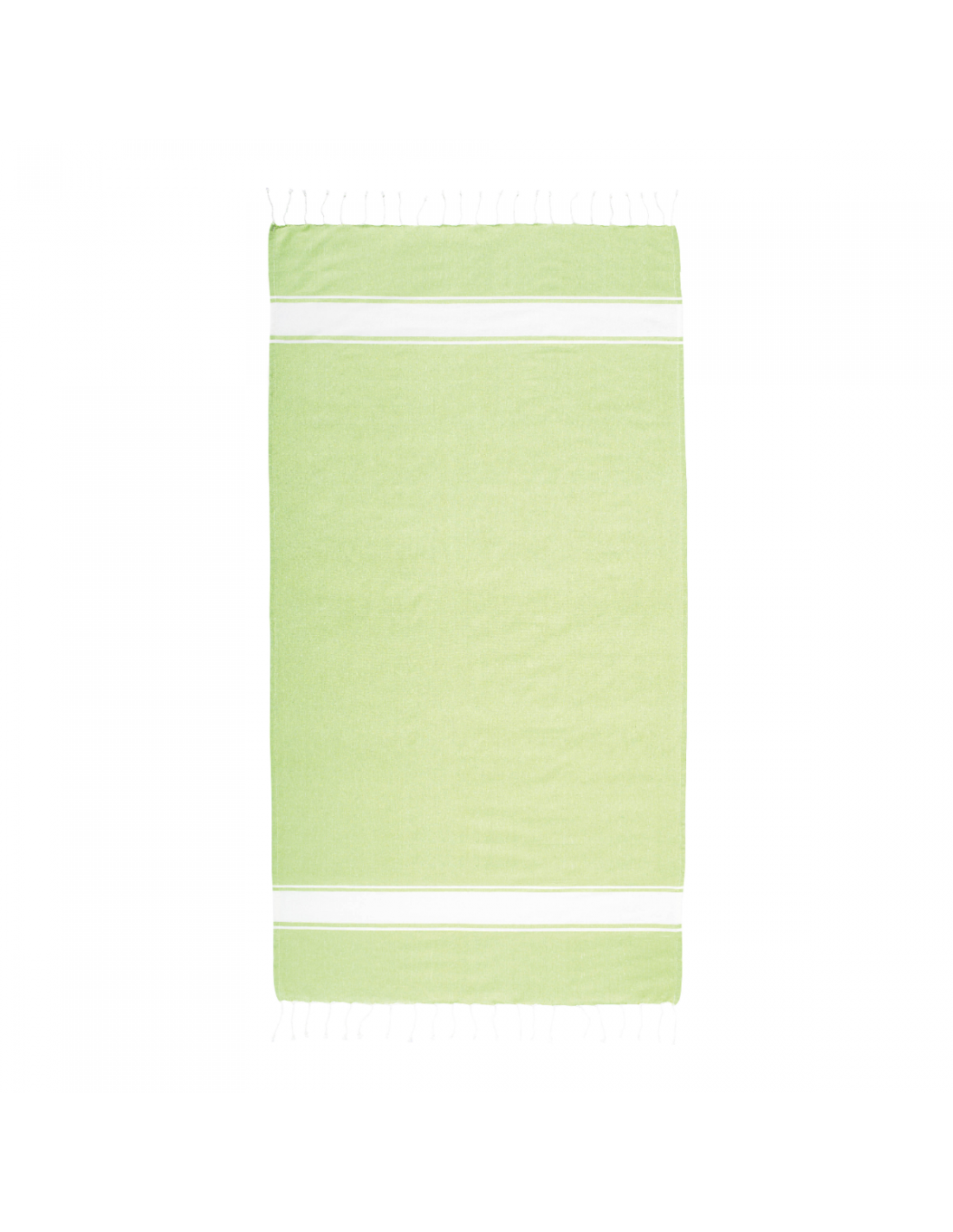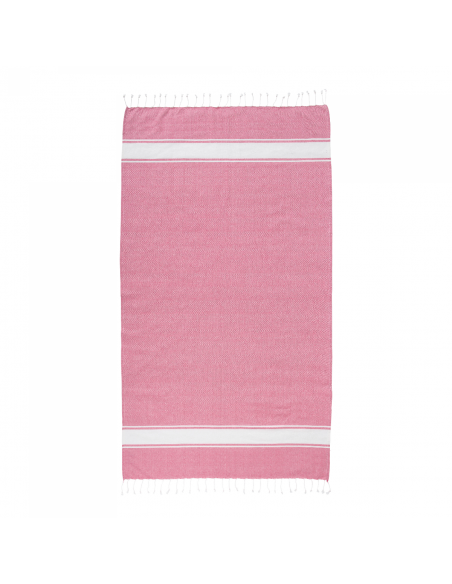 Serviette de plage en coton recyclé de 150 g/m² avec effet de mélange, deux bandes latérales et des franges. Elle est certifiée GRS (Global Recycled Standard).