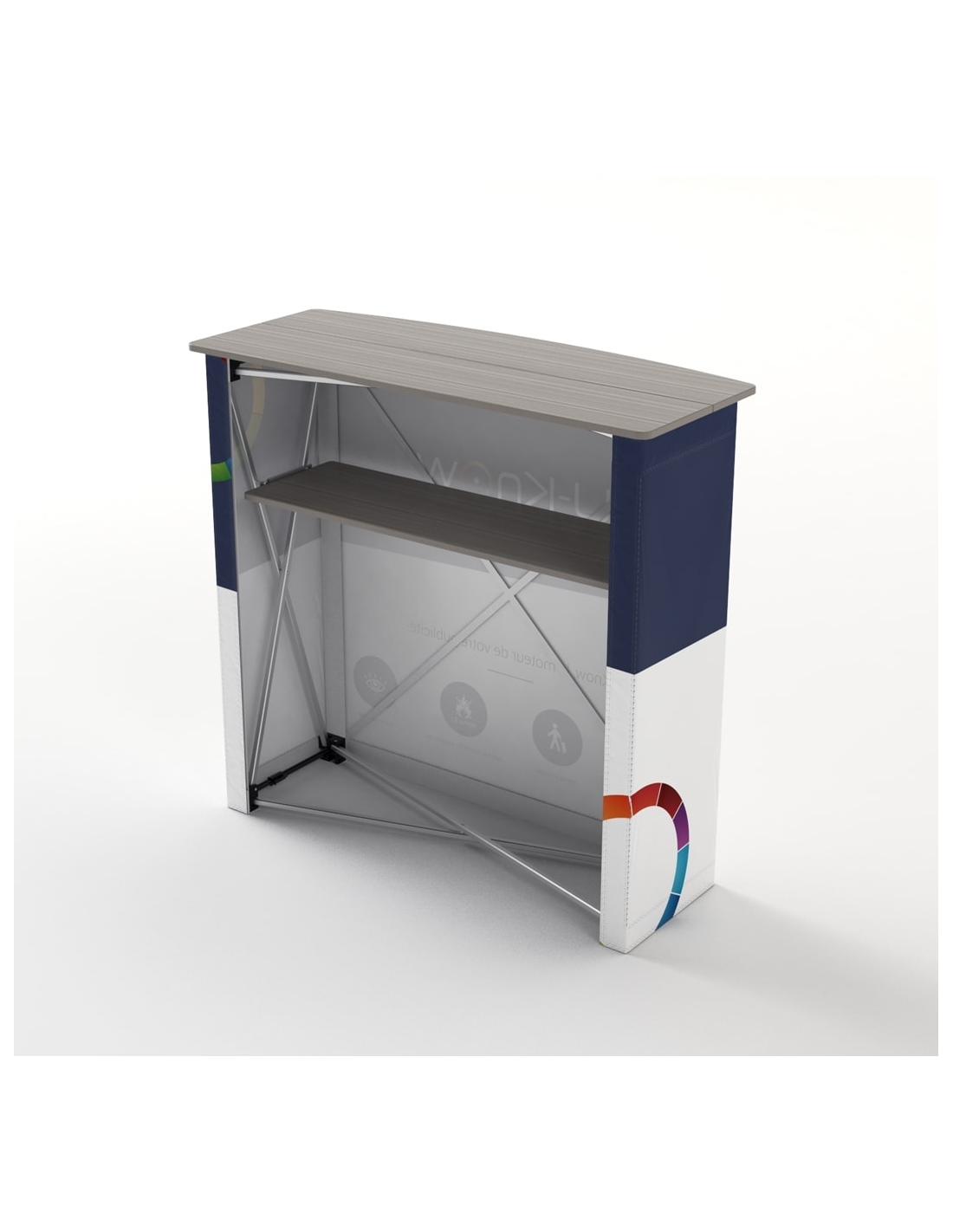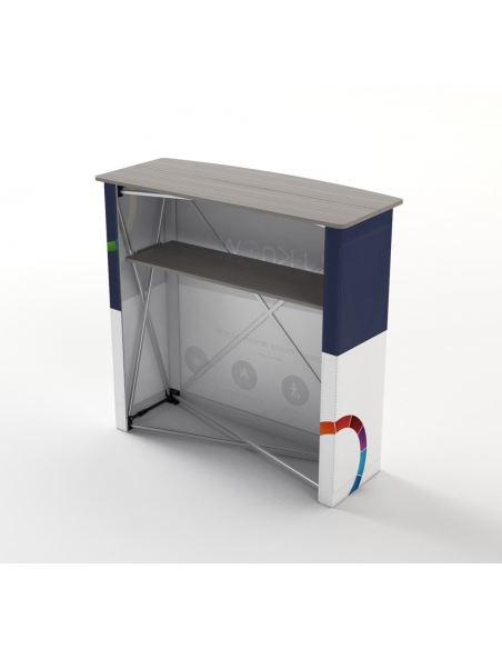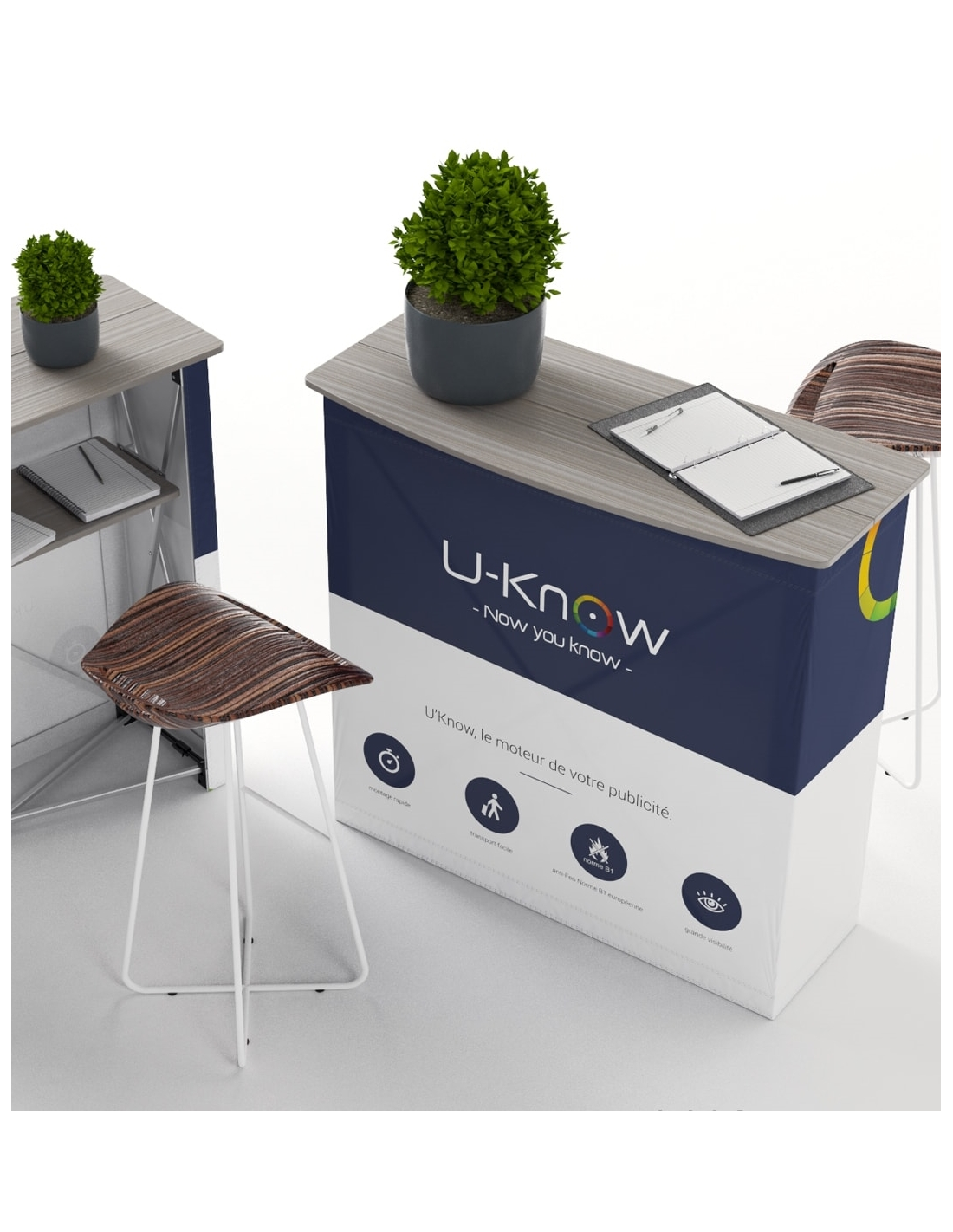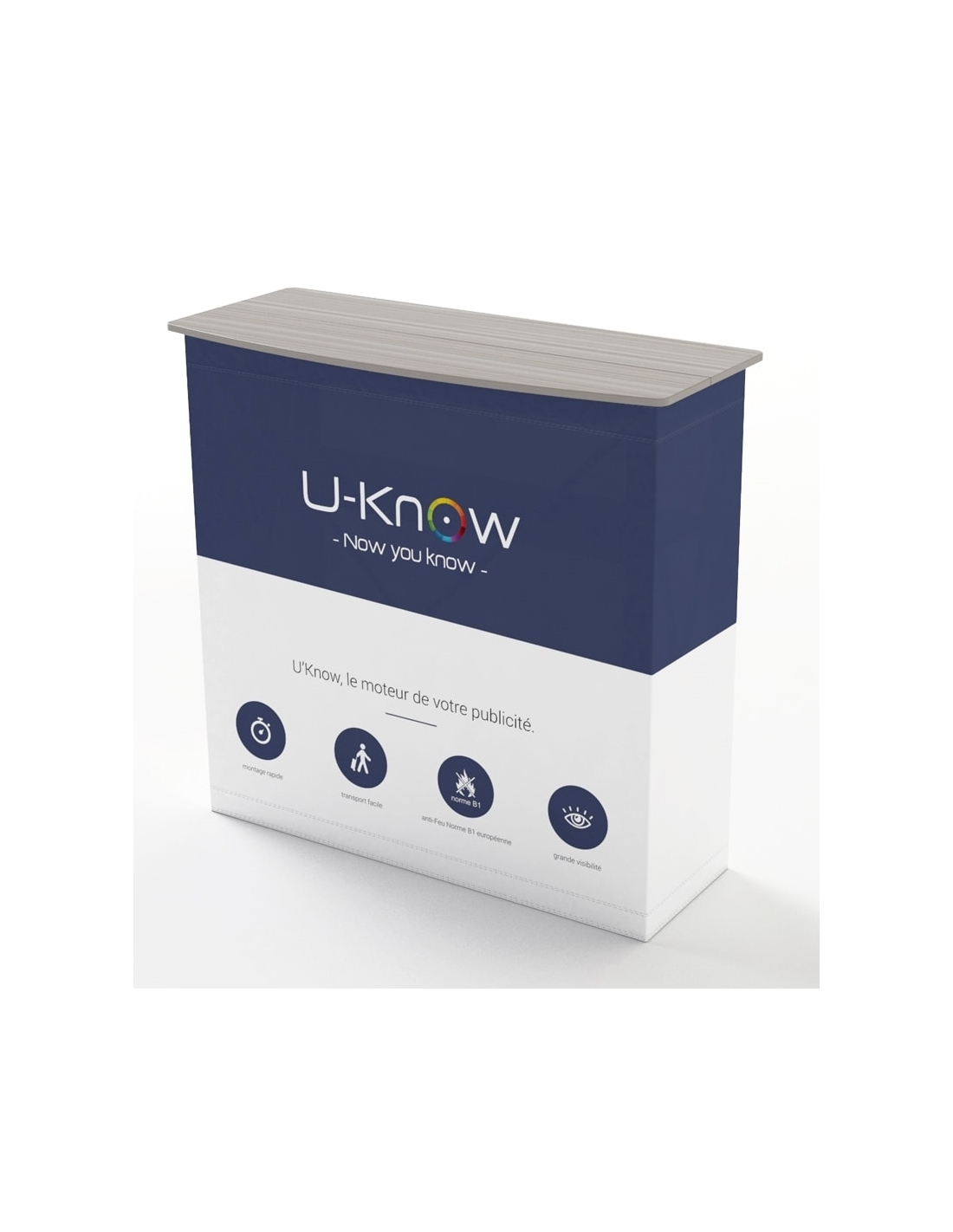 Facile à installer et démonter, cette structure en aluminium est composée de tubes carrés de diamètre 12 mm et se déploie en mode parapluie. La tablette supérieure est arrondie sur la face avant. Elle se plie en son milieu pour se ranger dans le sac de transport. Une tablette intérieure est dans la même finition. Le visuel en polyester sublimé est fixé par un velcro de 5 cm sur le contour. Pour démonter la structure, il