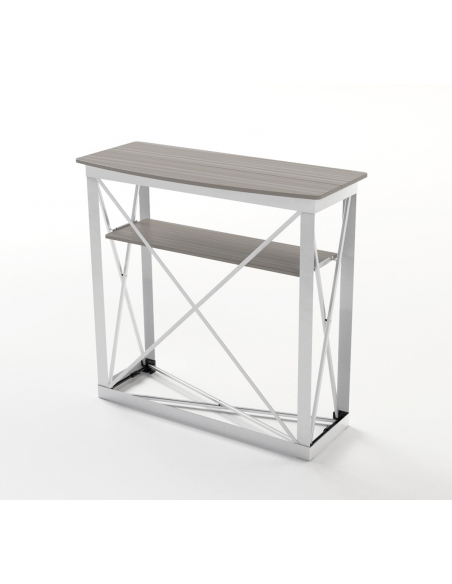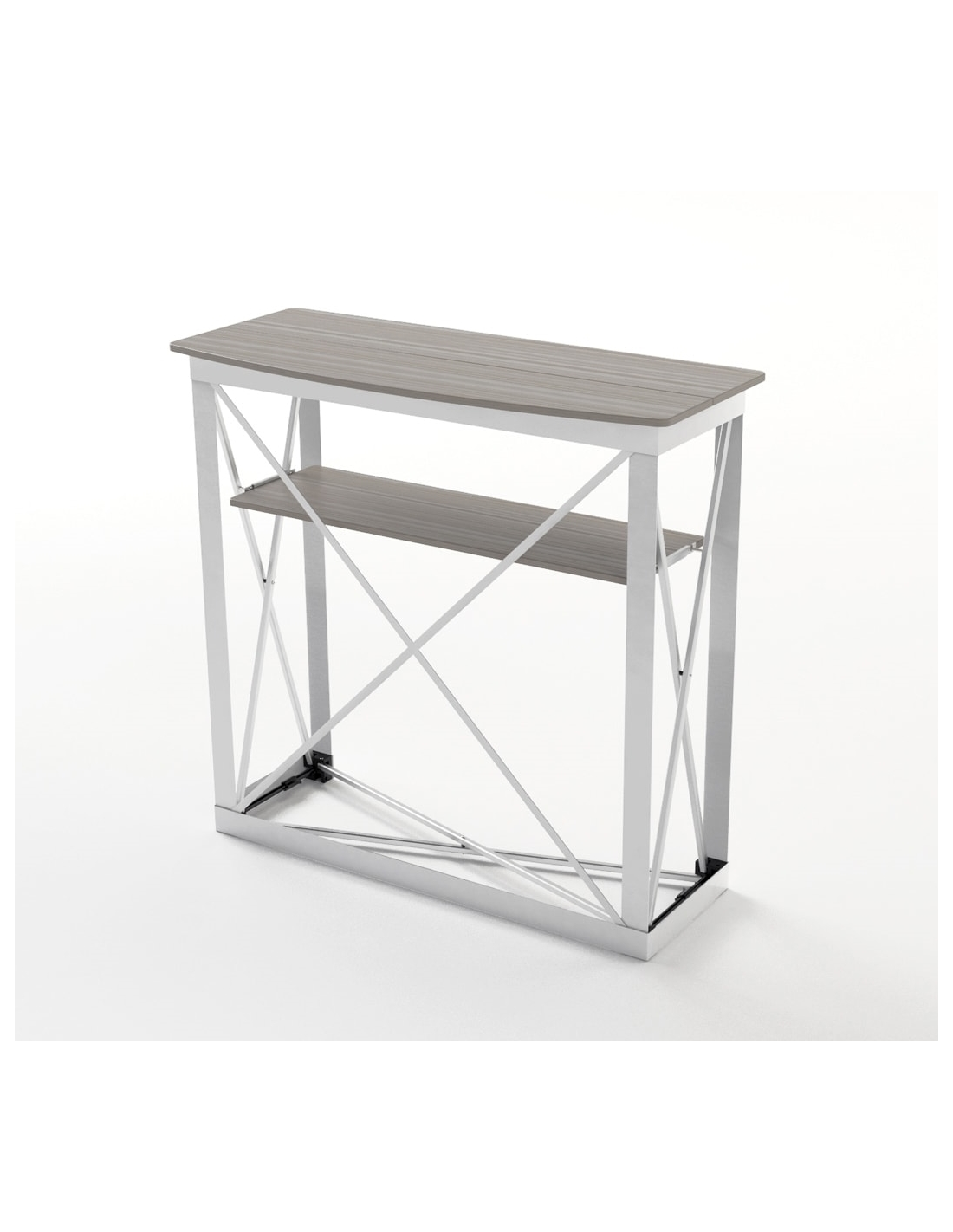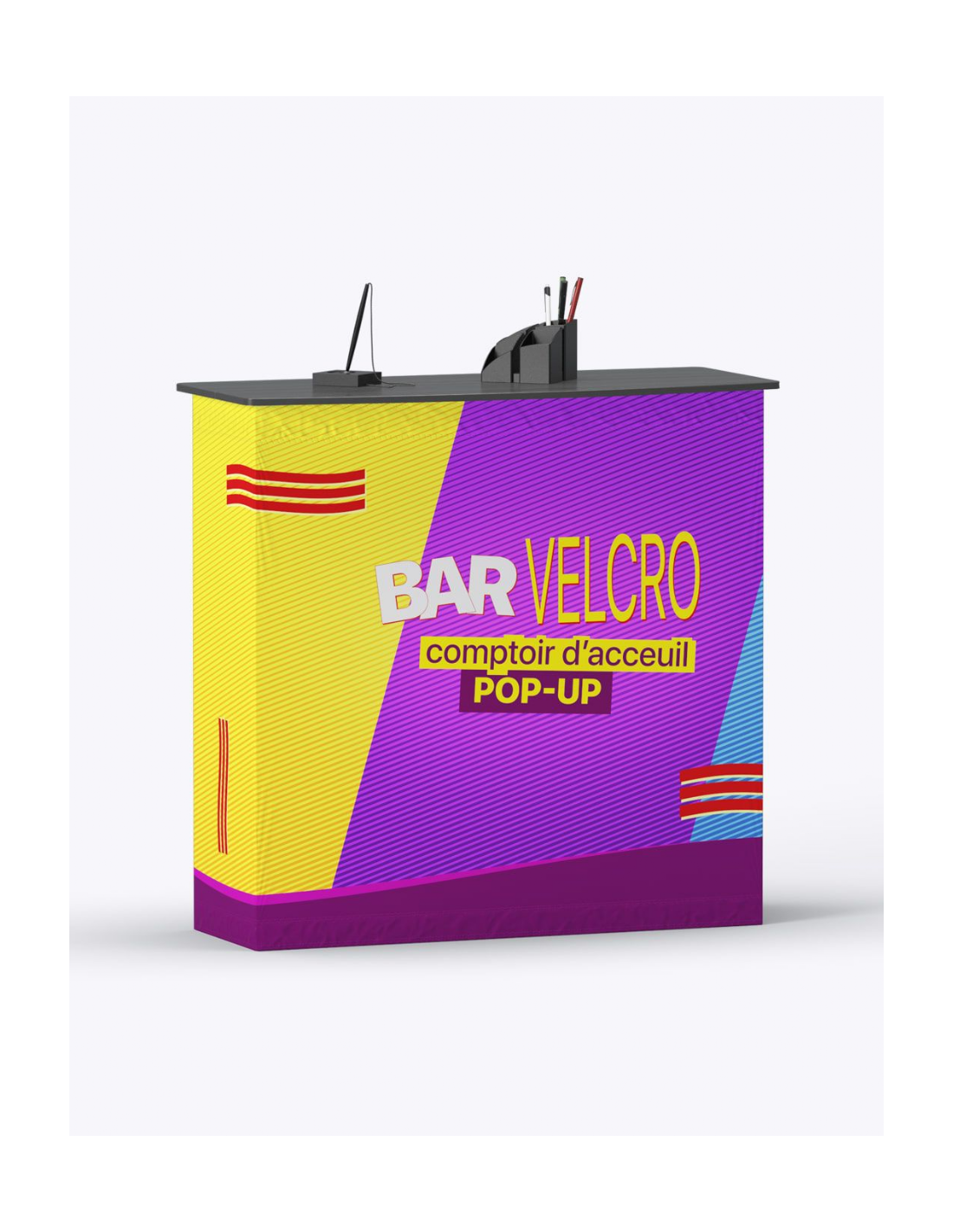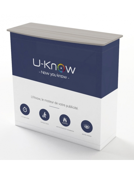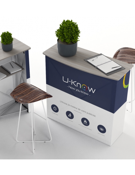 Facile à installer et démonter, cette structure en aluminium est composée de tubes carrés de diamètre 12 mm et se déploie en mode parapluie. La tablette supérieure est arrondie sur la face avant. Elle se plie en son milieu pour se ranger dans le sac de transport. Une tablette intérieure est dans la même finition. Le visuel en polyester sublimé est fixé par un velcro de 5 cm sur le contour. Pour démonter la structure, il