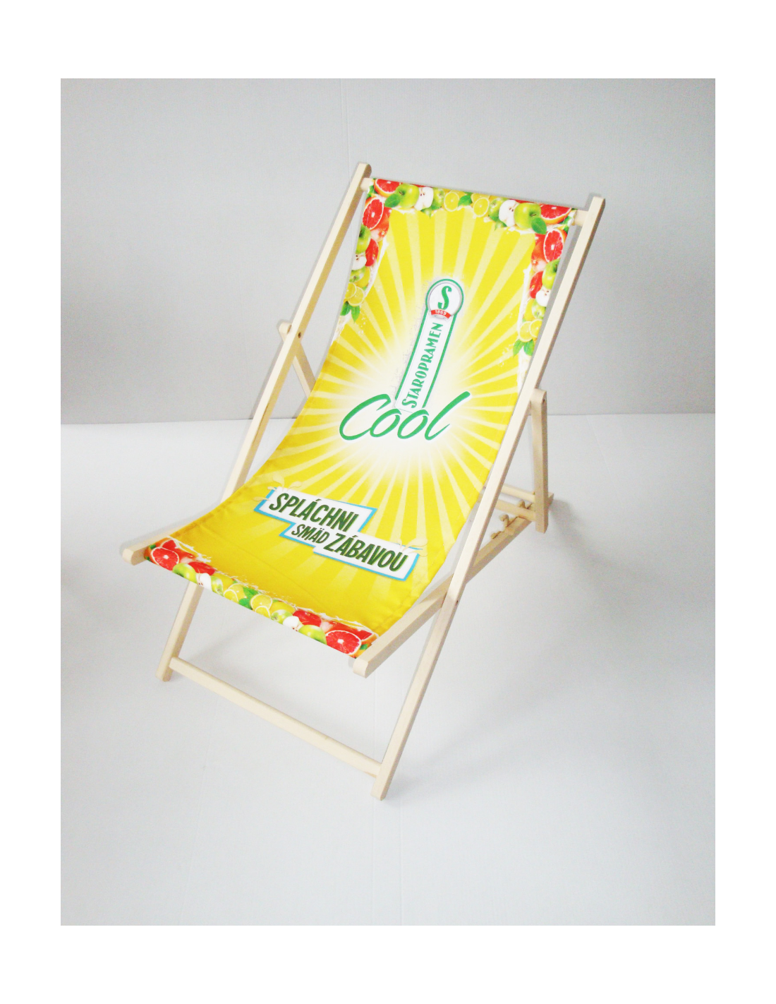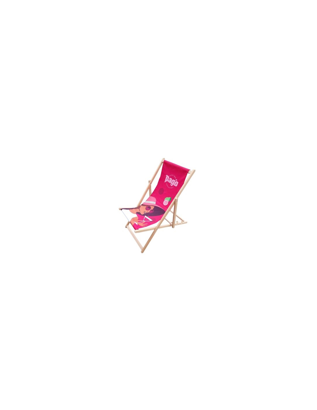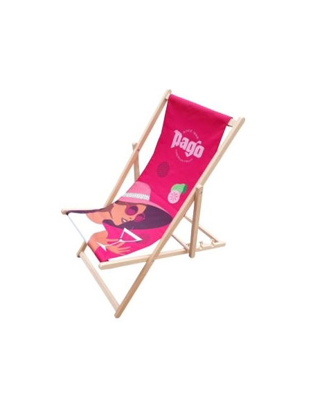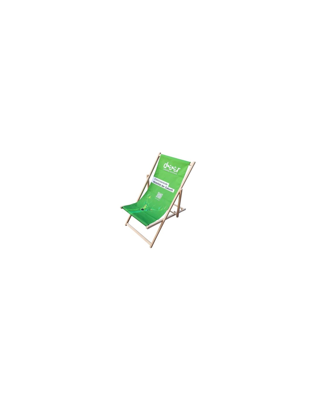 Transat publicitaire sans accoudoirs en hêtre massif avec toile imprimée à vos couleurs constitue non seulement un siège confortable sur un stand ou pendant un événement en plein air mais aussi un excellent support publicitaire.