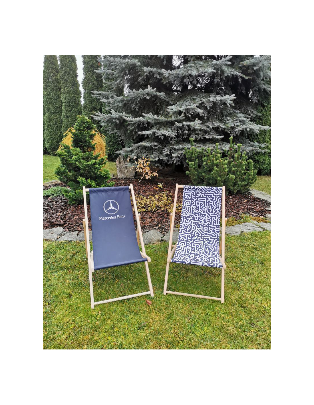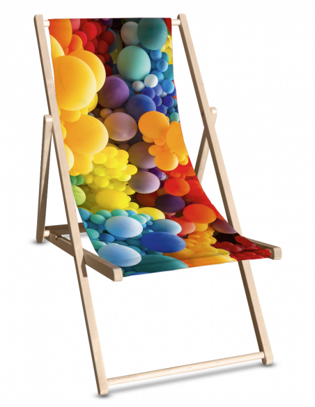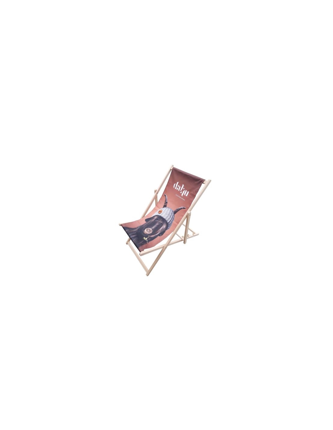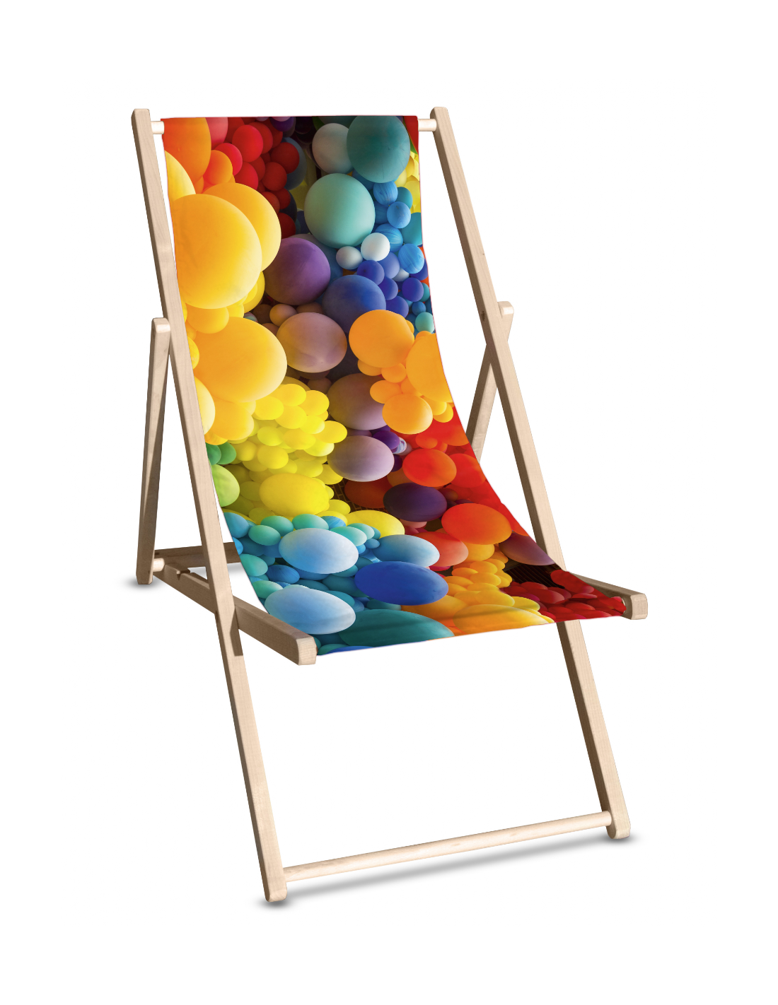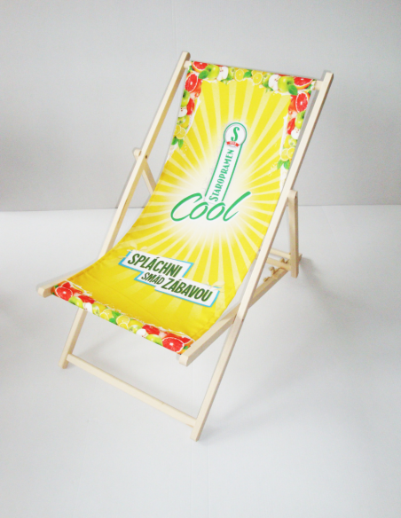 Transat publicitaire sans accoudoirs en hêtre massif avec toile imprimée à vos couleurs constitue non seulement un siège confortable sur un stand ou pendant un événement en plein air mais aussi un excellent support publicitaire.