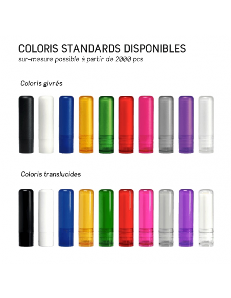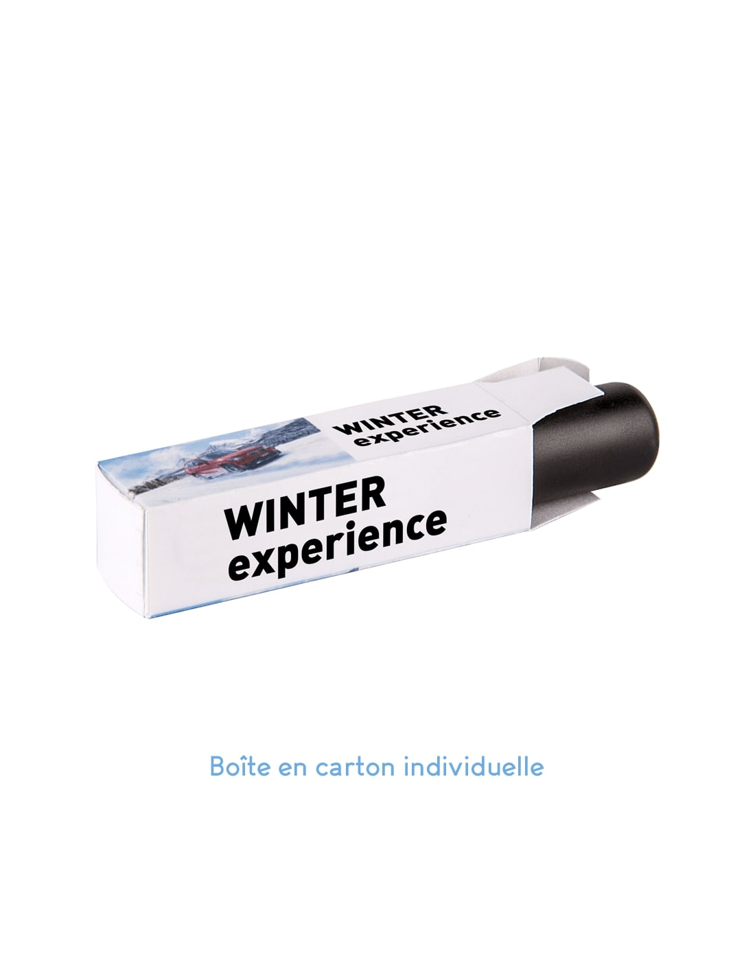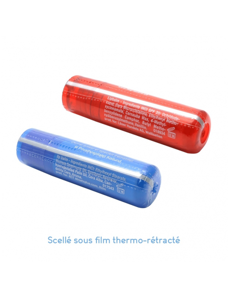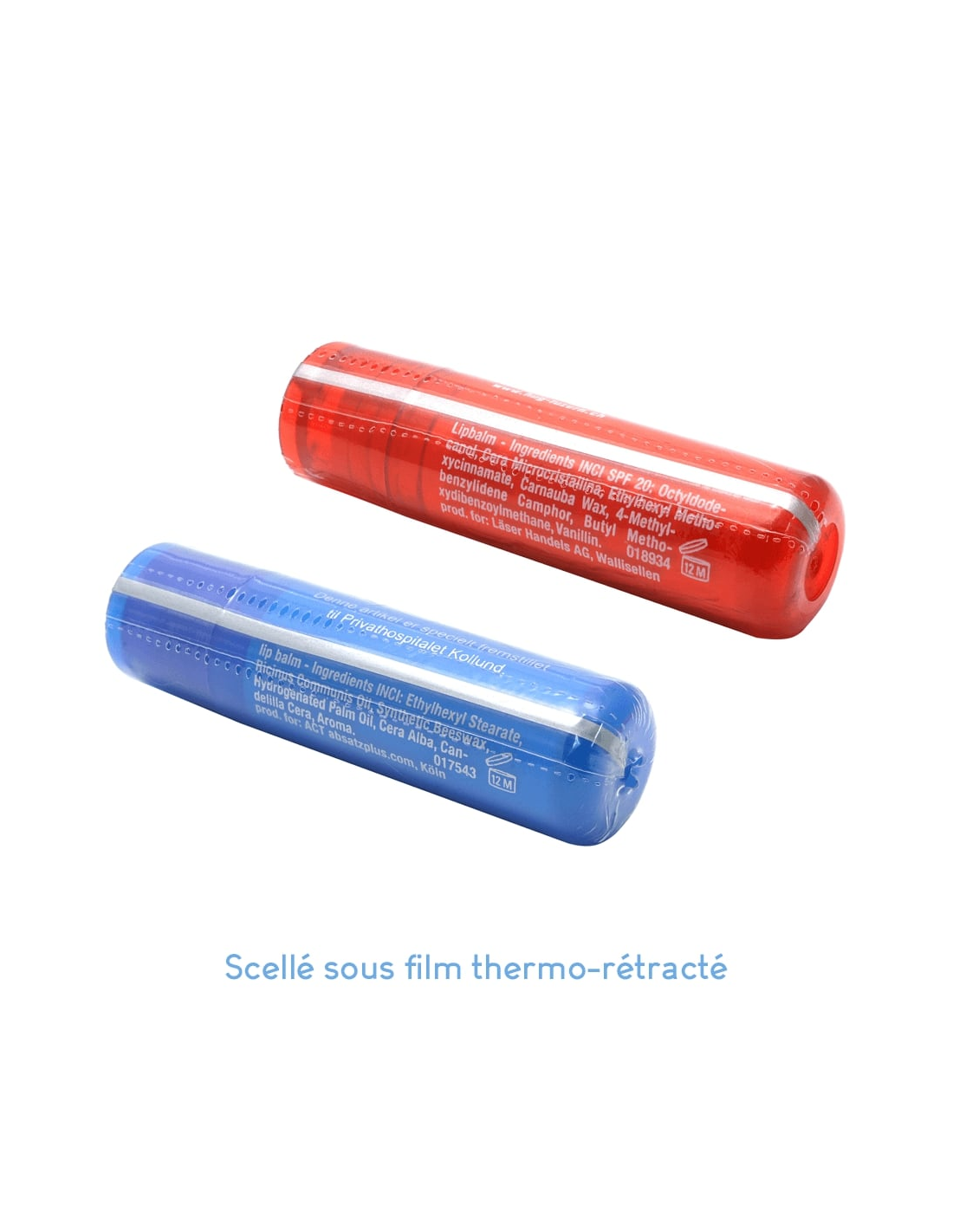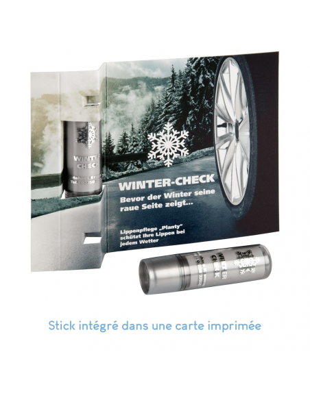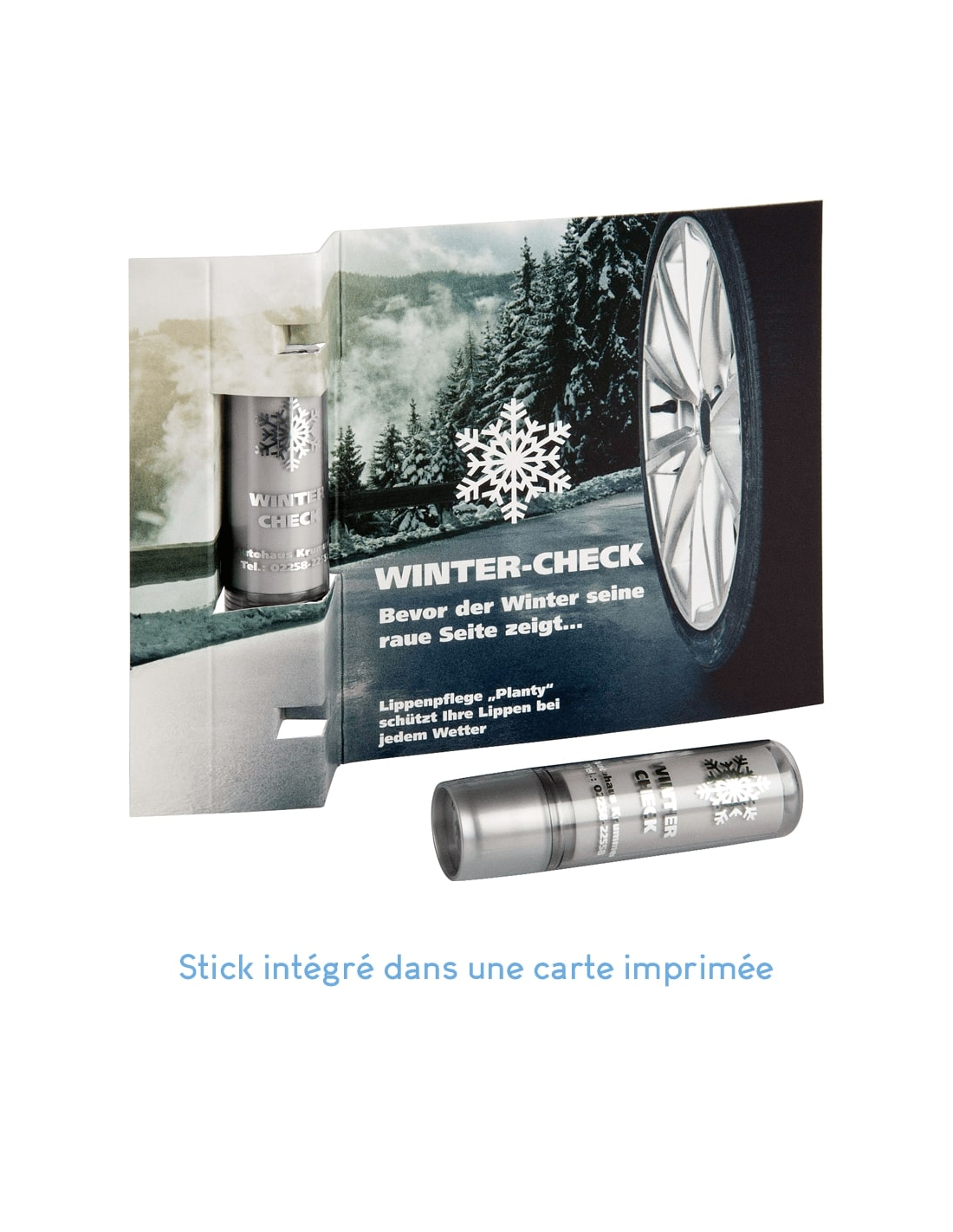 En option (1000 pcs min.) : indice SPF30, scellé sous film thermo-rétracté, boîte en carton individuelle ou intégré dans une carte imprimée.