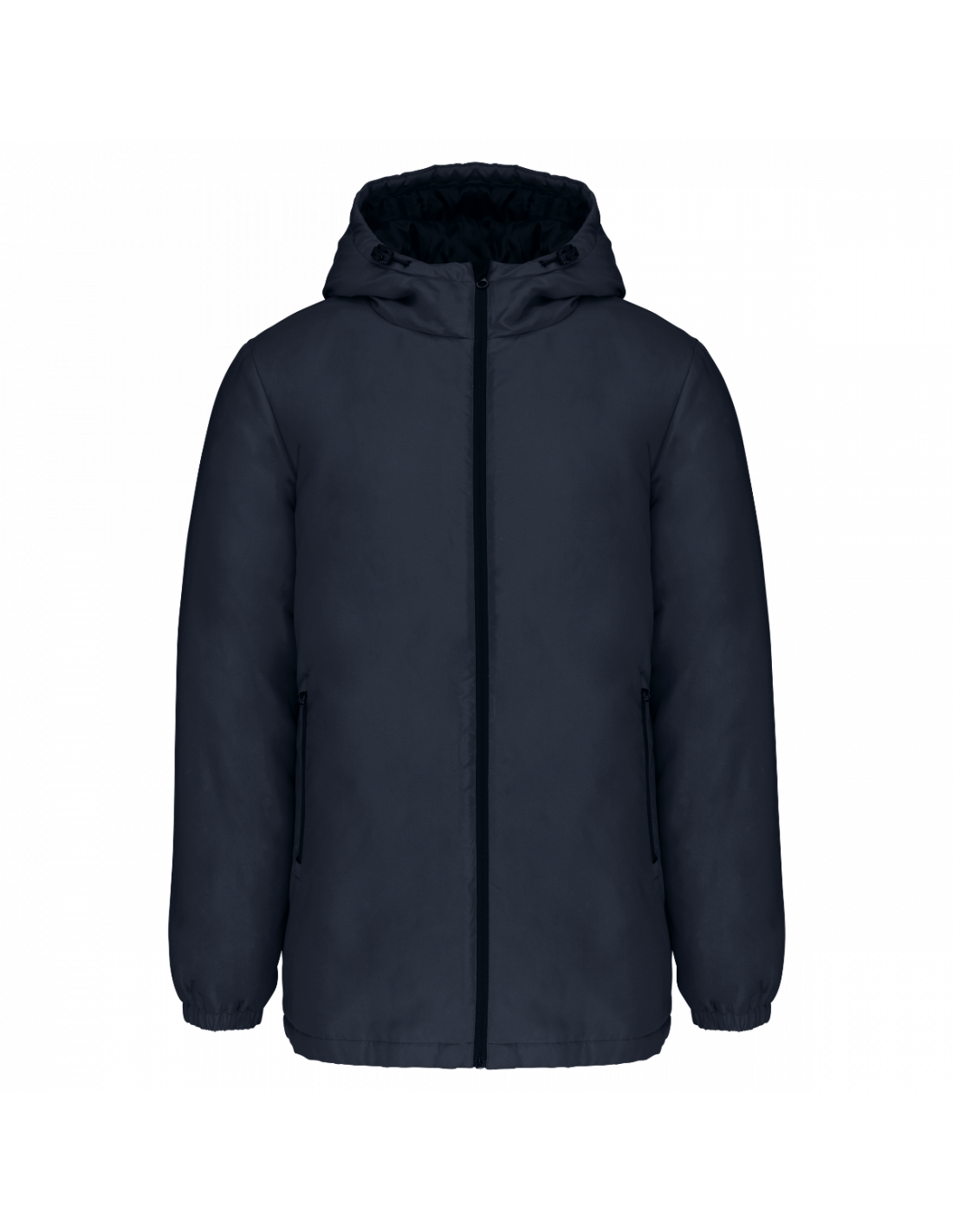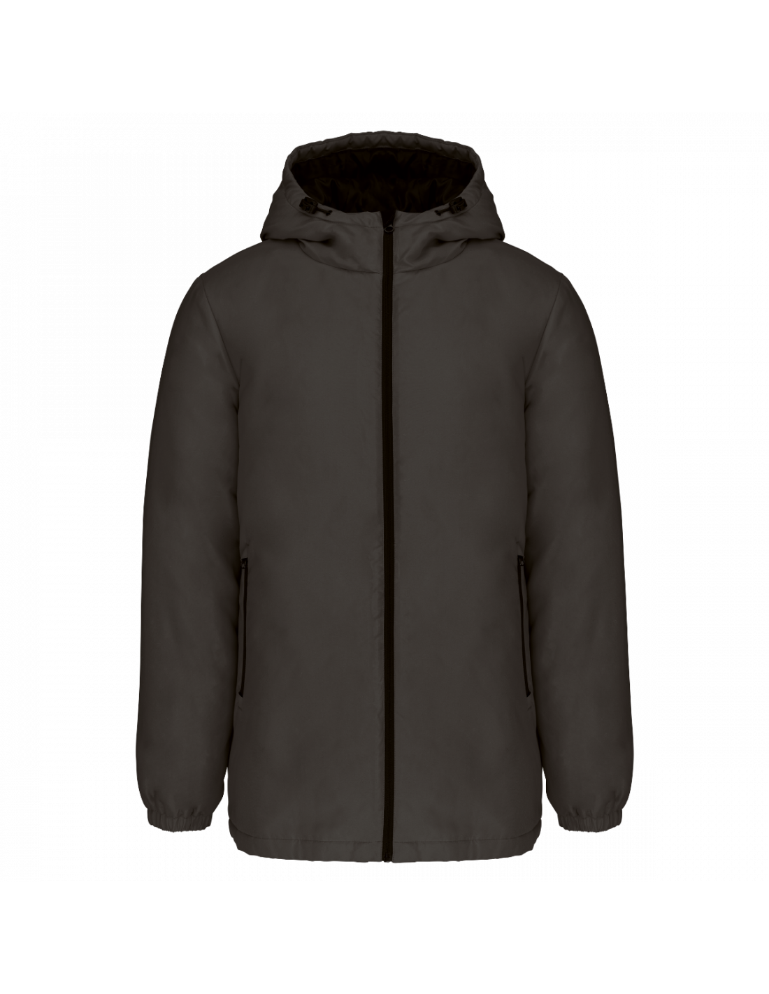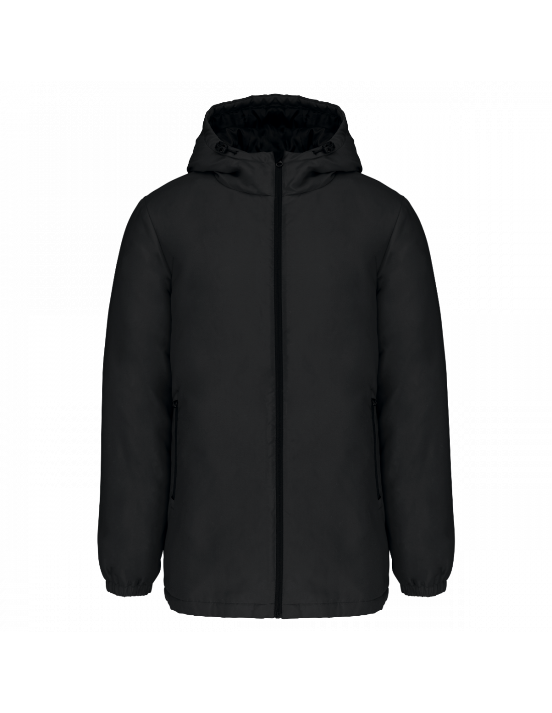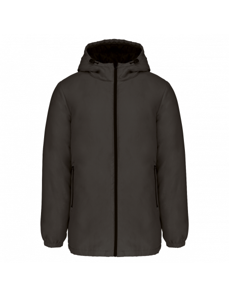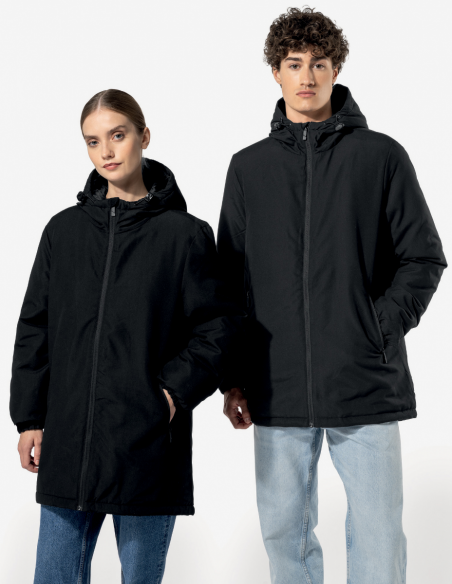 Tissu déperlant. Finition peau de pêche pour un toucher plus doux. Doublure polyester taffeta 210T noire. Intérieur matelassé 100% polyester. Coupe confort. Fermeture zippée nylon et tire-zip métal. Capuche 3 panneaux doublée polyester avec cordon de serrage et stoppeurs. 2 poches devant zippées. 1 poche intérieure avec fermeture par bande auto-agrippante. Bas de manches élastiqué. Dos rallongé pour plus de confort. Patch tissu intérieur col pour la personnalisation. Zip invisible côté cœur et bas de vêtement pour accès personnalisation. Pas d'étiquette de marque pour faciliter la personnalisation.