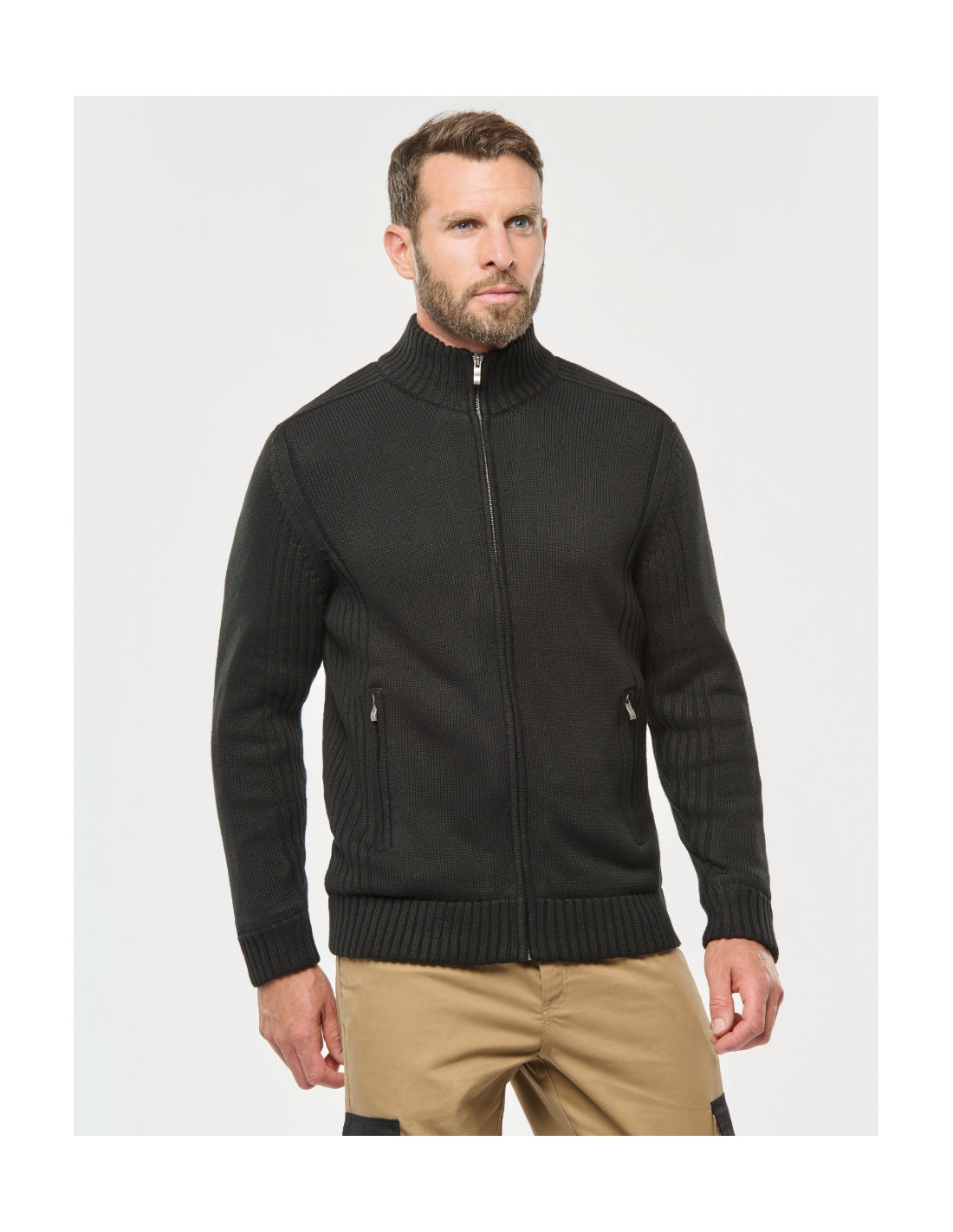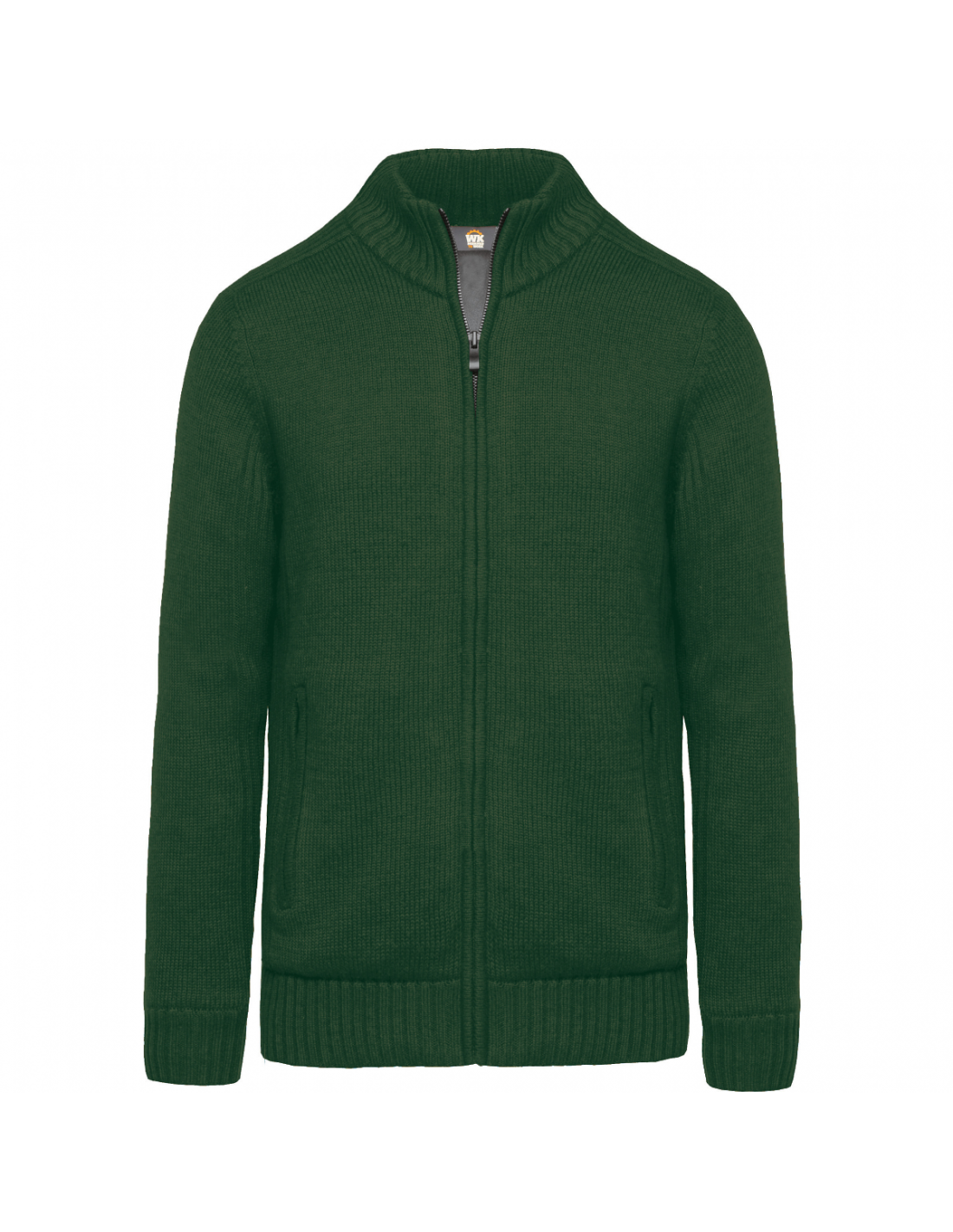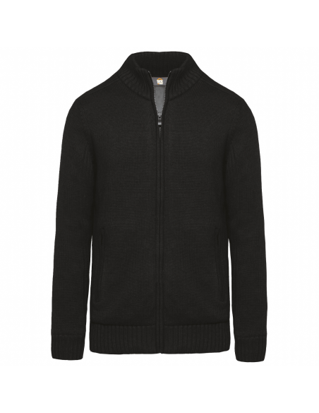 Matières chaudes et confortables. 2 poches et fermeture avant zippées. Tricotage en côtes 2 x 2 aux épaules, côtés et manches. Bord-côte 2 x 2 doublé au col, bas de manches et de vêtement. Zip invisible intérieur côté pour accès personnalisation côté ou dos.