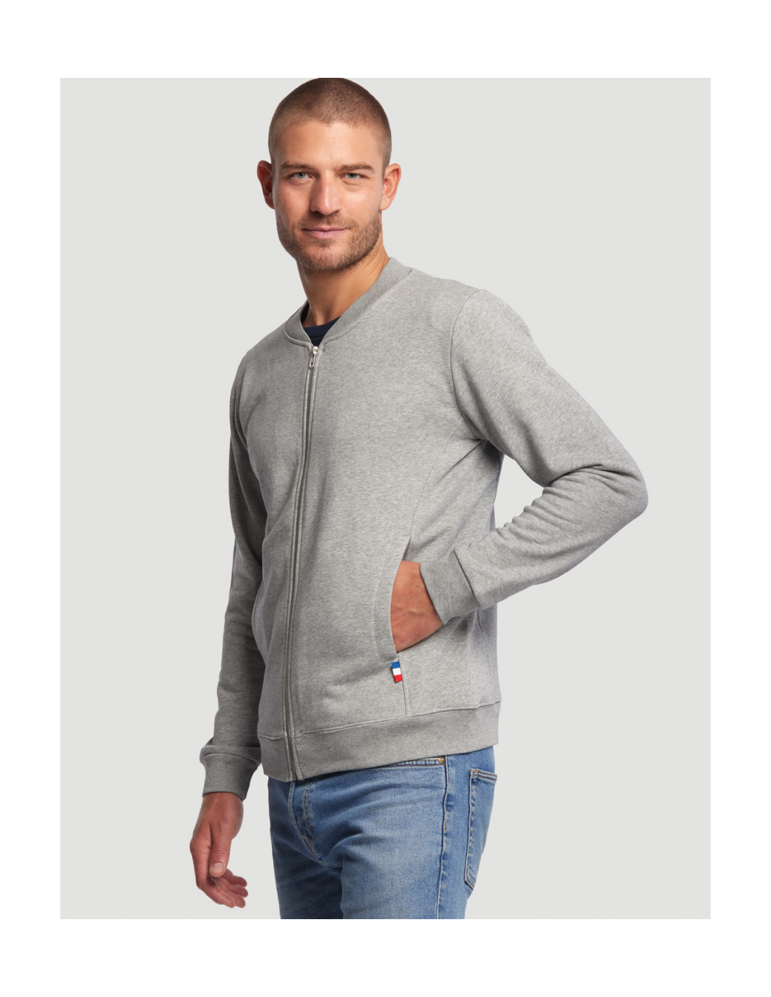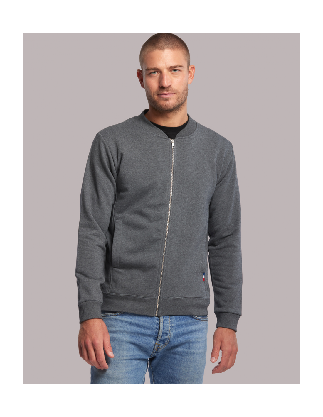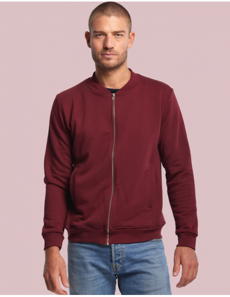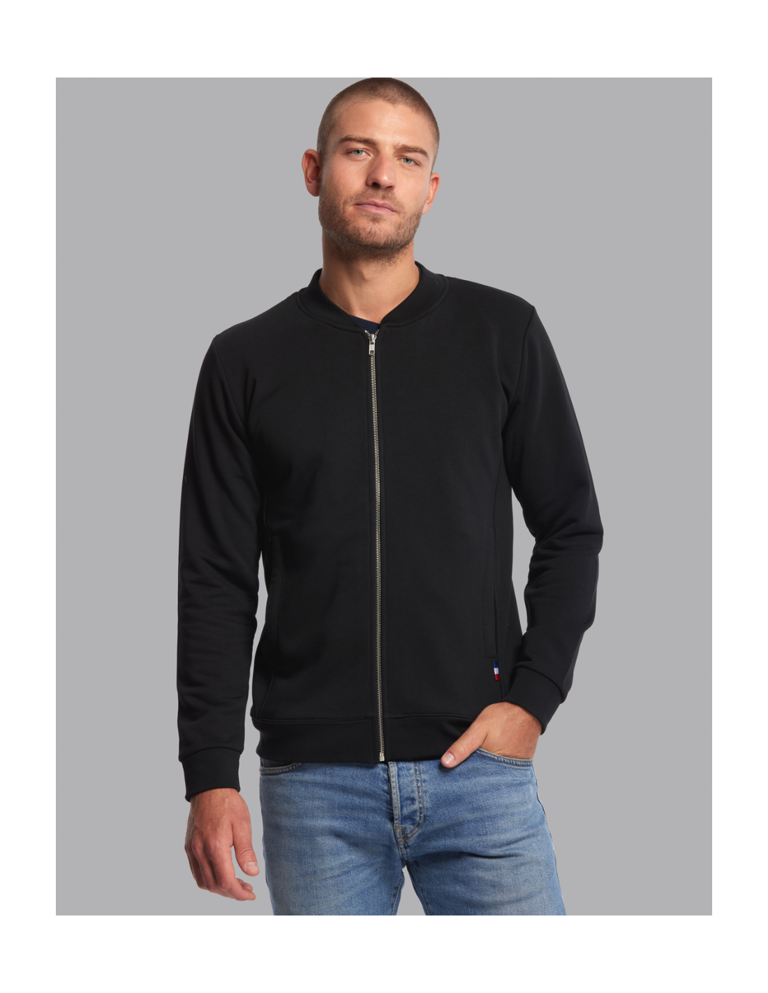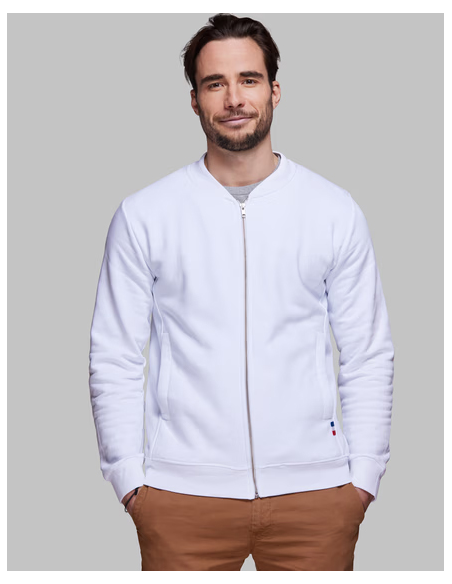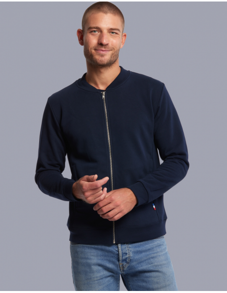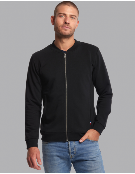 Blouson Made in France façon Teddy. 2 poches mains passepoilées. Matière Terry 350g/m² lavée, non grattée pour éviter le boulochage + traitement silicone pour améliorer la longévité du vêtement. Col en demi lune. Double piqure en bas de veste. Bande de propreté au col. Zip central YKK.