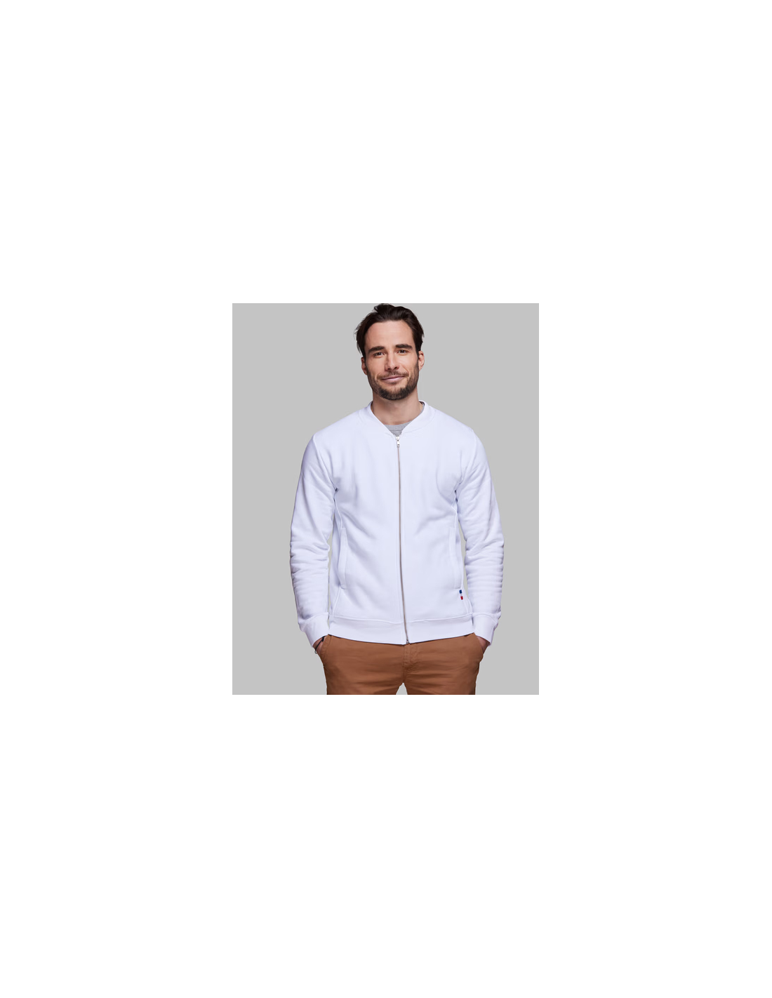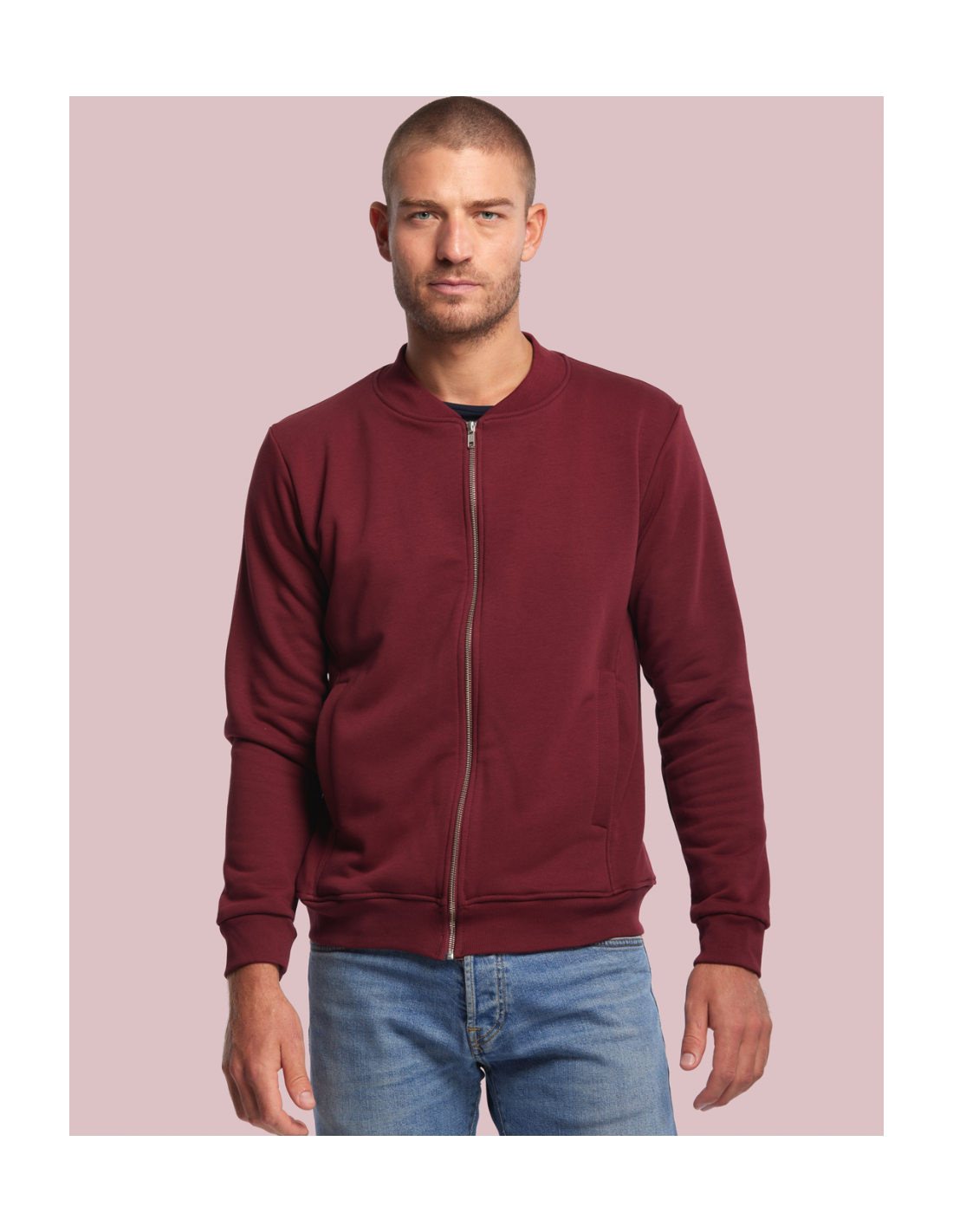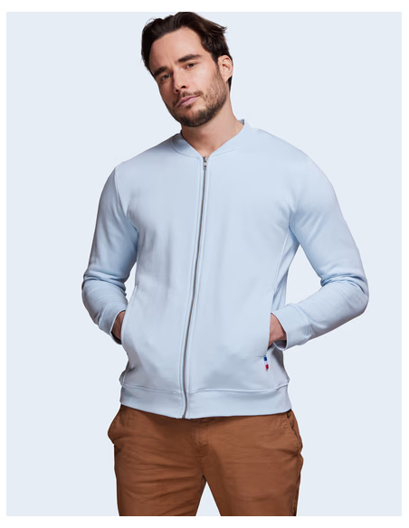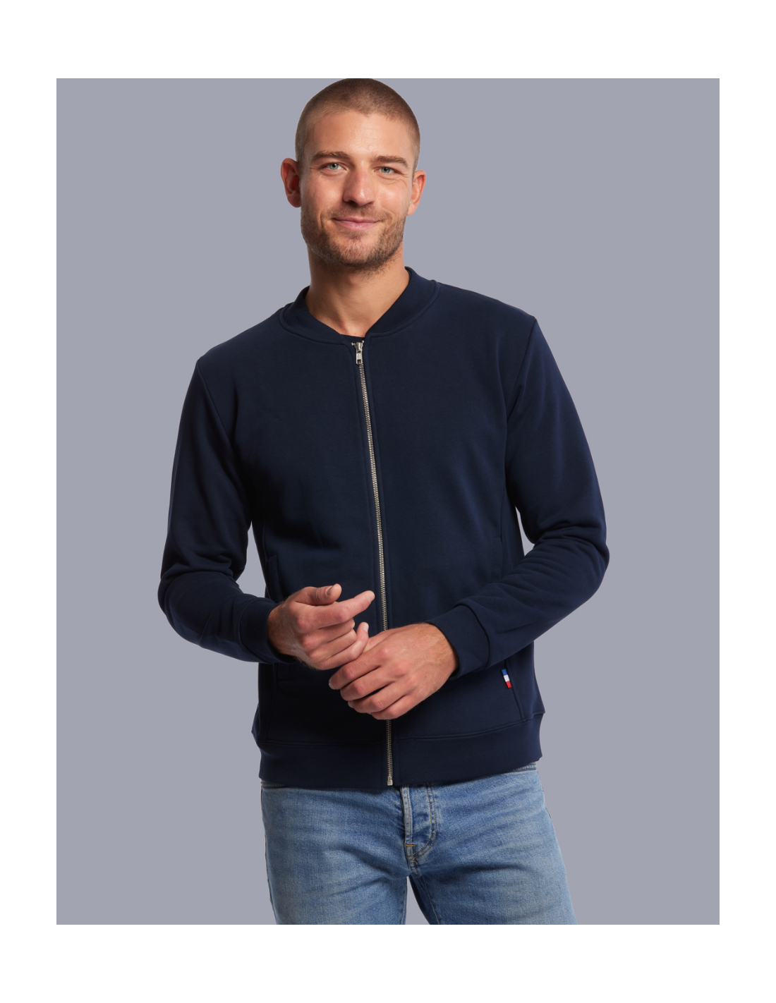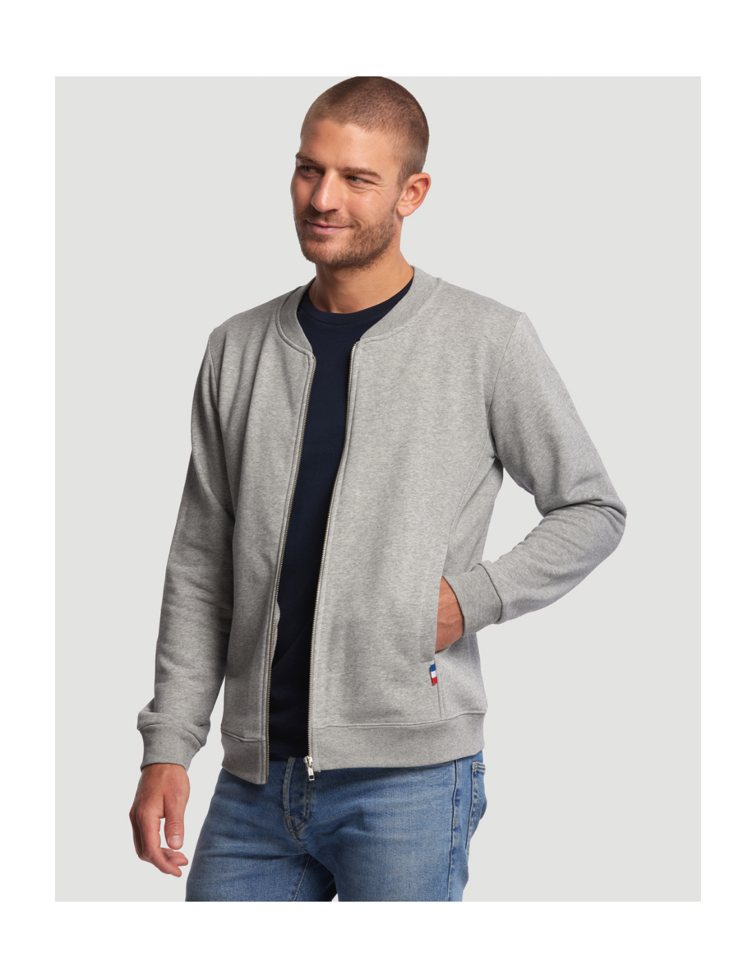 Blouson Made in France façon Teddy. 2 poches mains passepoilées. Matière Terry 350g/m² lavée, non grattée pour éviter le boulochage + traitement silicone pour améliorer la longévité du vêtement. Col en demi lune. Double piqure en bas de veste. Bande de propreté au col. Zip central YKK.