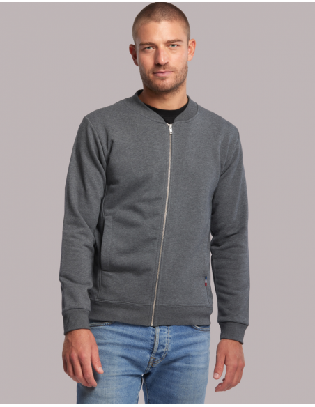 Blouson Made in France façon Teddy. 2 poches mains passepoilées. Matière Terry 350g/m² lavée, non grattée pour éviter le boulochage + traitement silicone pour améliorer la longévité du vêtement. Col en demi lune. Double piqure en bas de veste. Bande de propreté au col. Zip central YKK.
