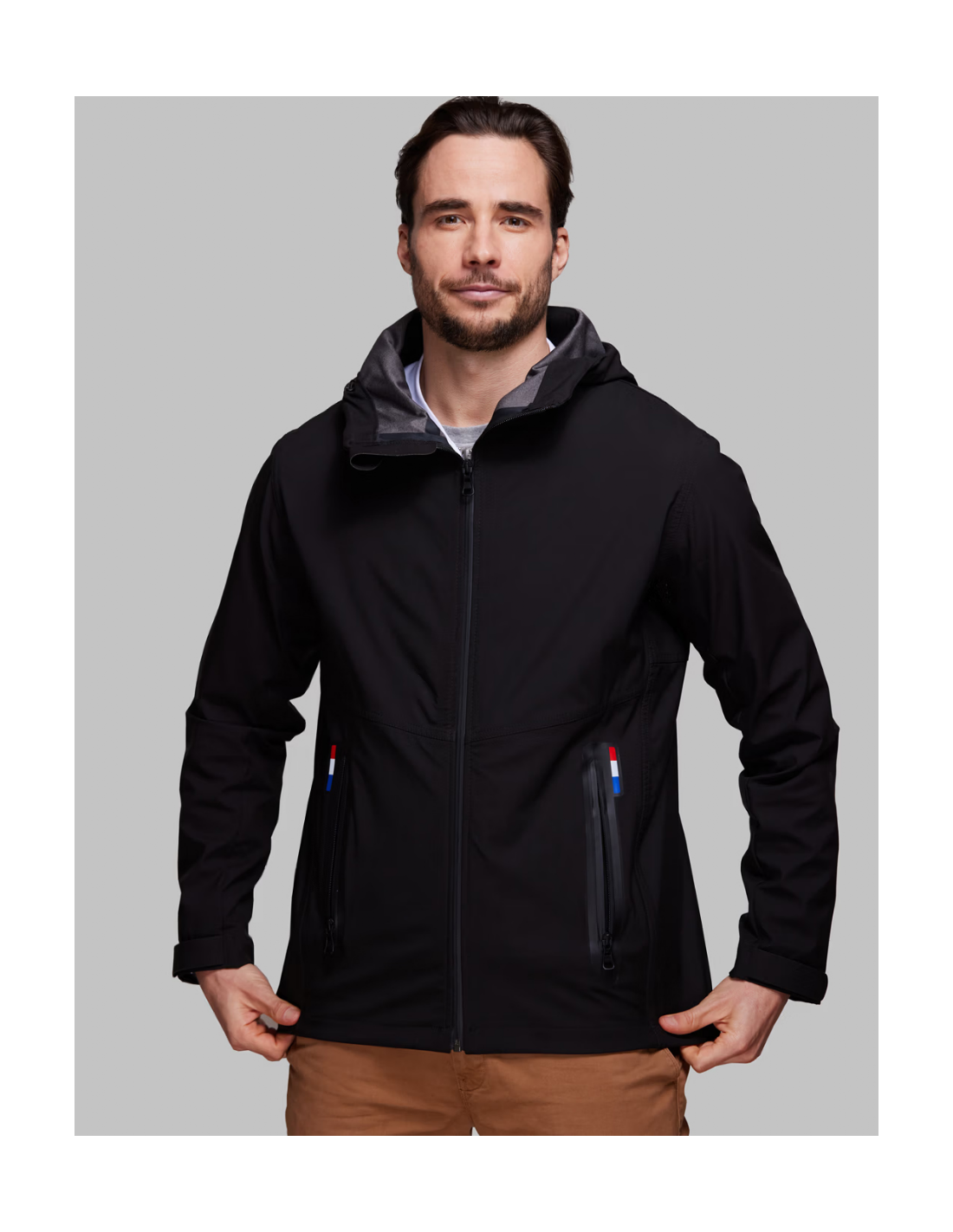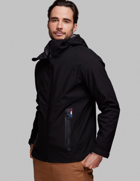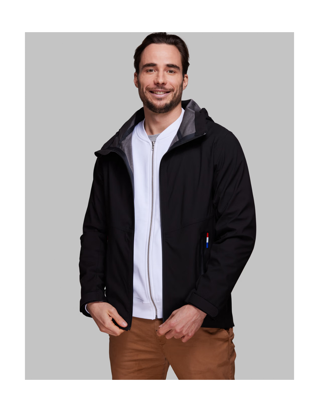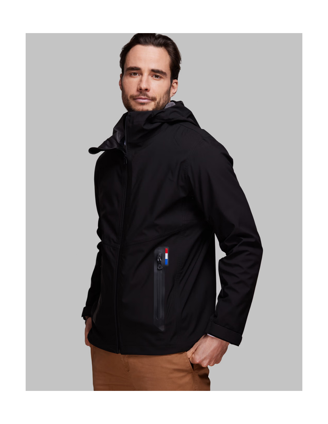 Coupe-vent ultra-technique Made in France. Confectionné dans l'Oise, ce blouson coupe-vent est composé à 50% de polyester recyclé. Softshell imperméable et respirante 2.5 couches avec membrane en TPU. Colonne d'eau 10000/3000 imperméable/respirant. Construction soudée et étanche. 2 poches mains soudées et étanches avec fermeture YKK waterproof. Zip central YKK imperméable. Coupe droite. Aération sous les bras et au niveau du protège menton avec découpe laser. Accroche Velcro en bas de manche. Capuche élastiquée profonde.