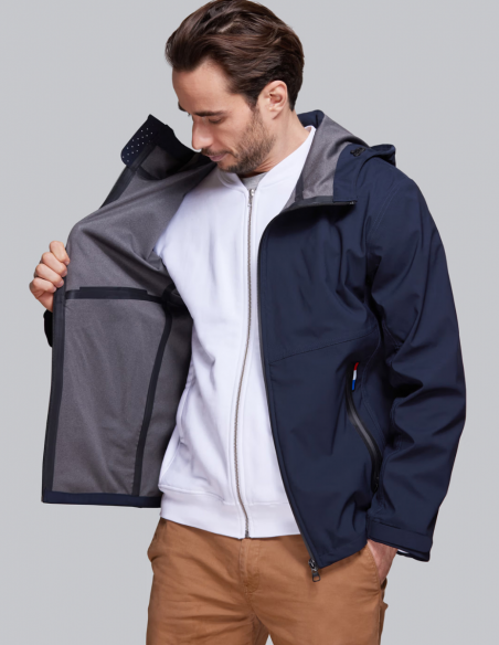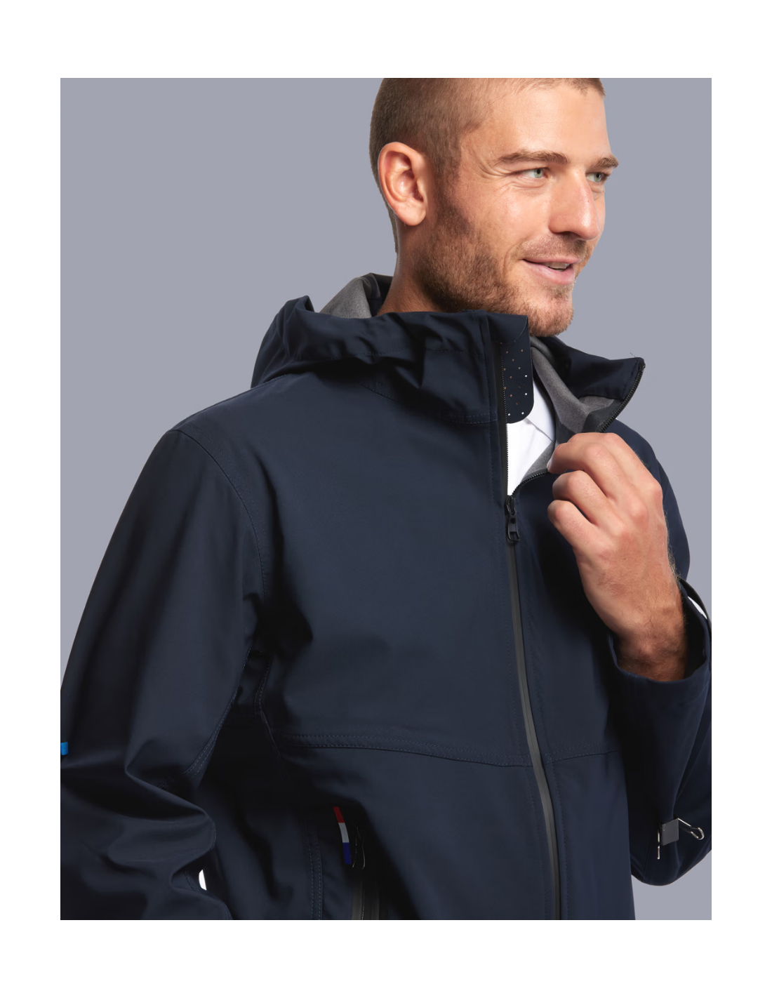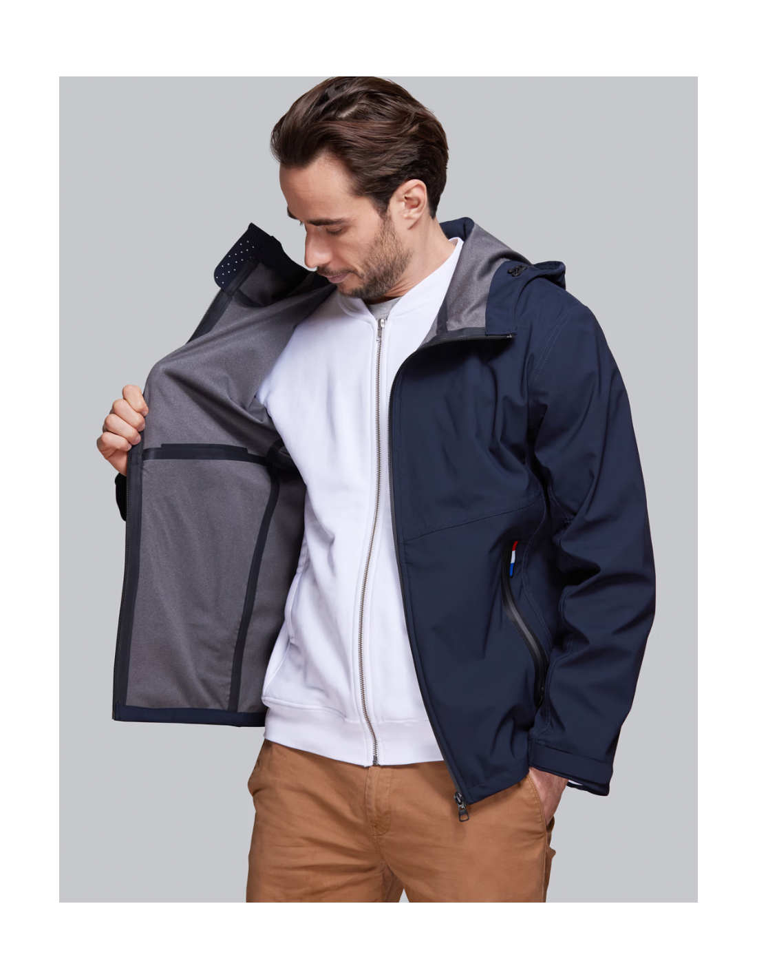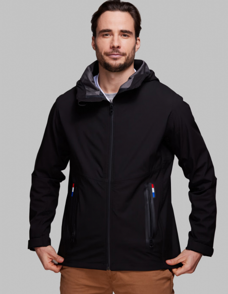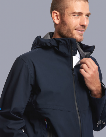 Coupe-vent ultra-technique Made in France. Confectionné dans l'Oise, ce blouson coupe-vent est composé à 50% de polyester recyclé. Softshell imperméable et respirante 2.5 couches avec membrane en TPU. Colonne d'eau 10000/3000 imperméable/respirant. Construction soudée et étanche. 2 poches mains soudées et étanches avec fermeture YKK waterproof. Zip central YKK imperméable. Coupe droite. Aération sous les bras et au niveau du protège menton avec découpe laser. Accroche Velcro en bas de manche. Capuche élastiquée profonde.