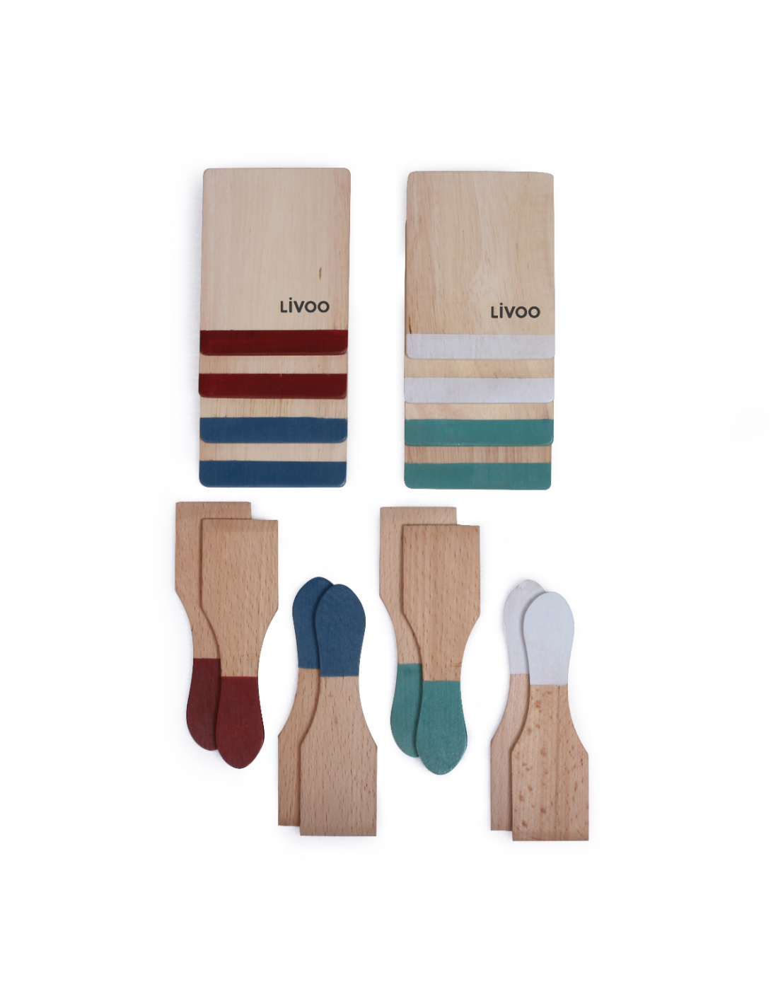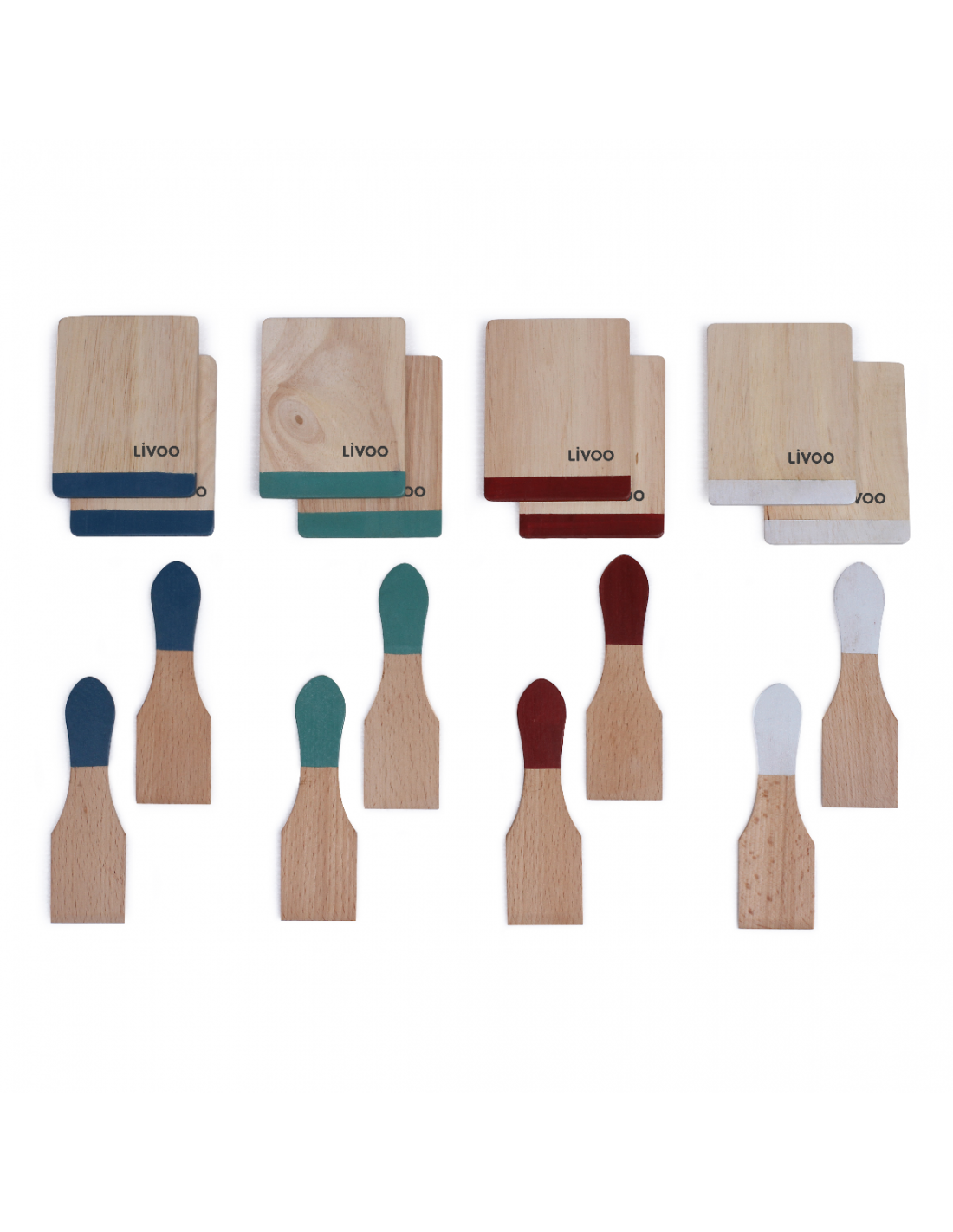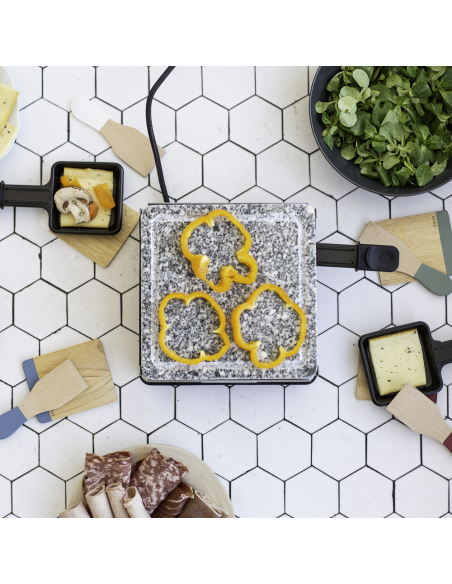 Set pour raclette contenant 8 spatules en bois pour vider les poêlons, 8 planchettes en bois pour poser les poêlons à raclette, une pochette de rangement.