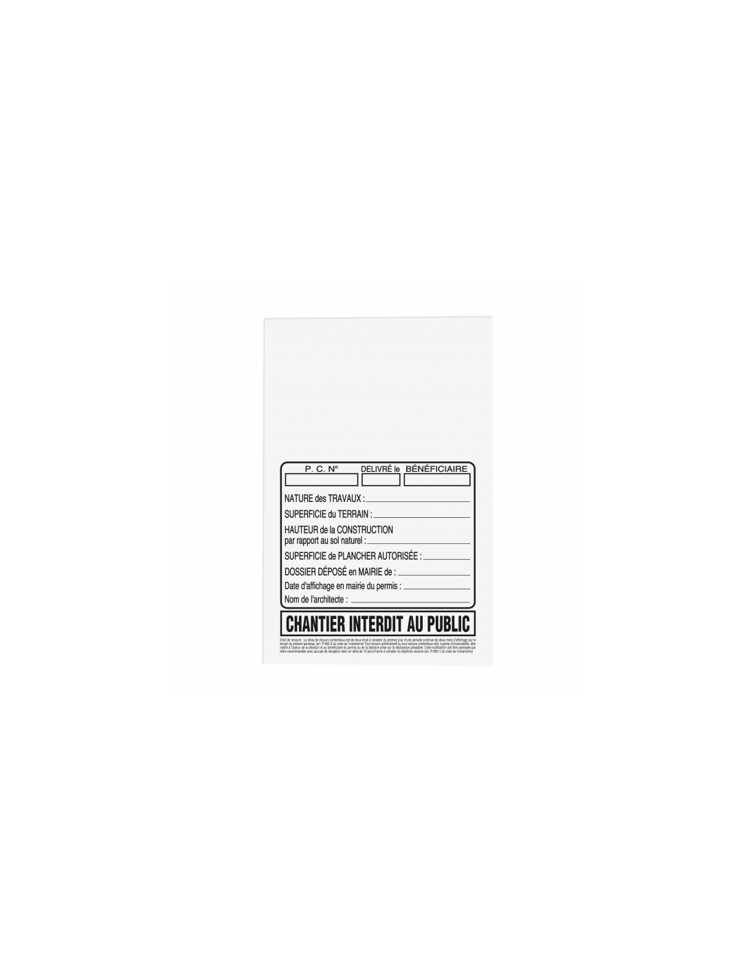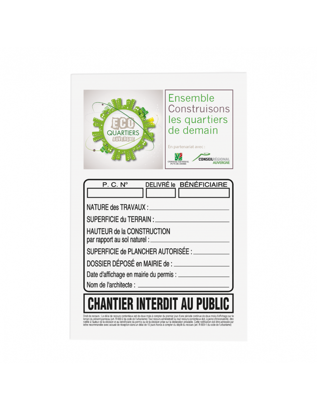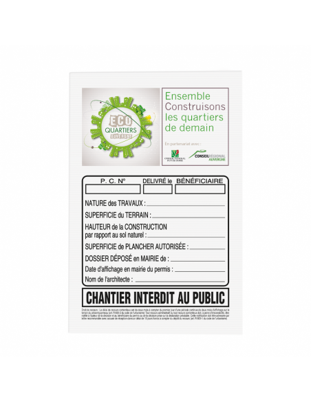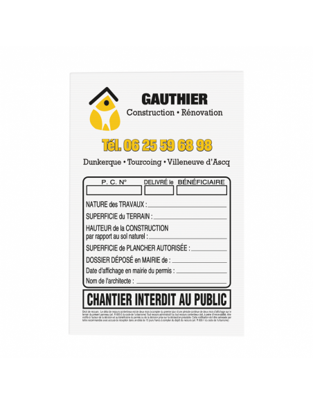 Panneau de chantier. Texte légal imprimé conforme pour les constructions. En sans marquage le texte légal est imprimé en noir. Fabrication française.