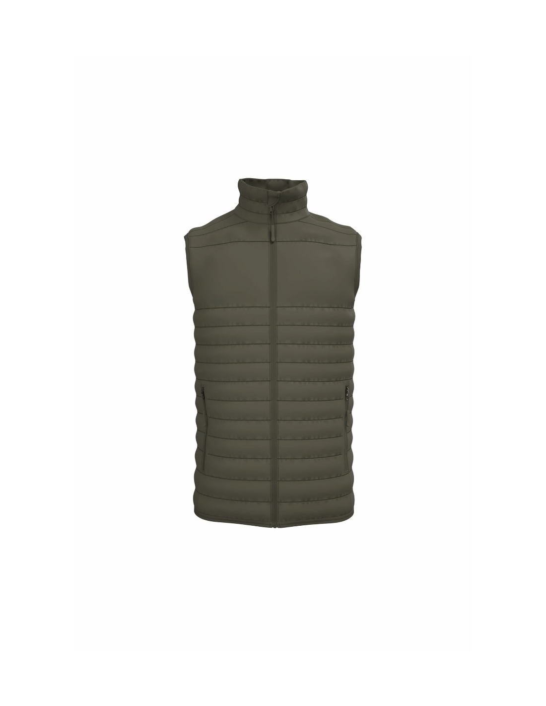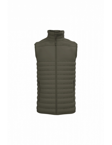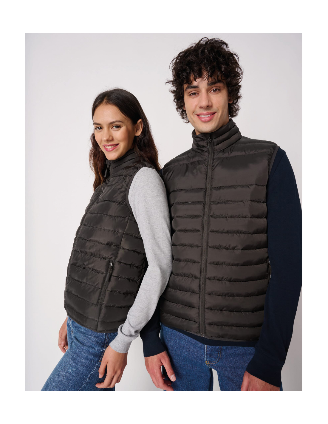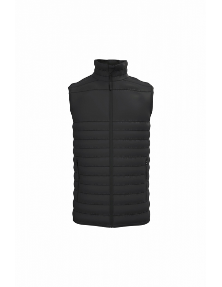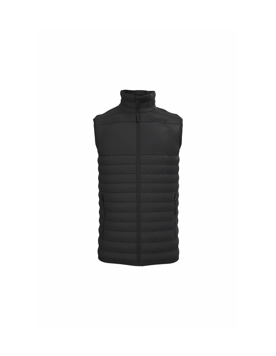 Coupe droite. Col montant. Deux poches côtés doublées en 290T, avec zips en nylon et tire-zips ton sur ton. Deux poches intérieures. Fermeture zippée en nylon ton sur ton avec protège-menton et tire-zip. Matelassage horizontal. Bande de matelassage plus large de 11 cm à l'avant et de 14,5 cm dans le dos, favorisant la personnalisation. Finition biais élastiqué emmanchures et bas de vêtement ton sur ton. Boucle d’accroche intérieure col. Produit compressible dans son sac de rangement. Etiquette de marque détachable. Garniture injectée : le grammage peut varier selon les zones du vêtement. Le poids total est indicatif.