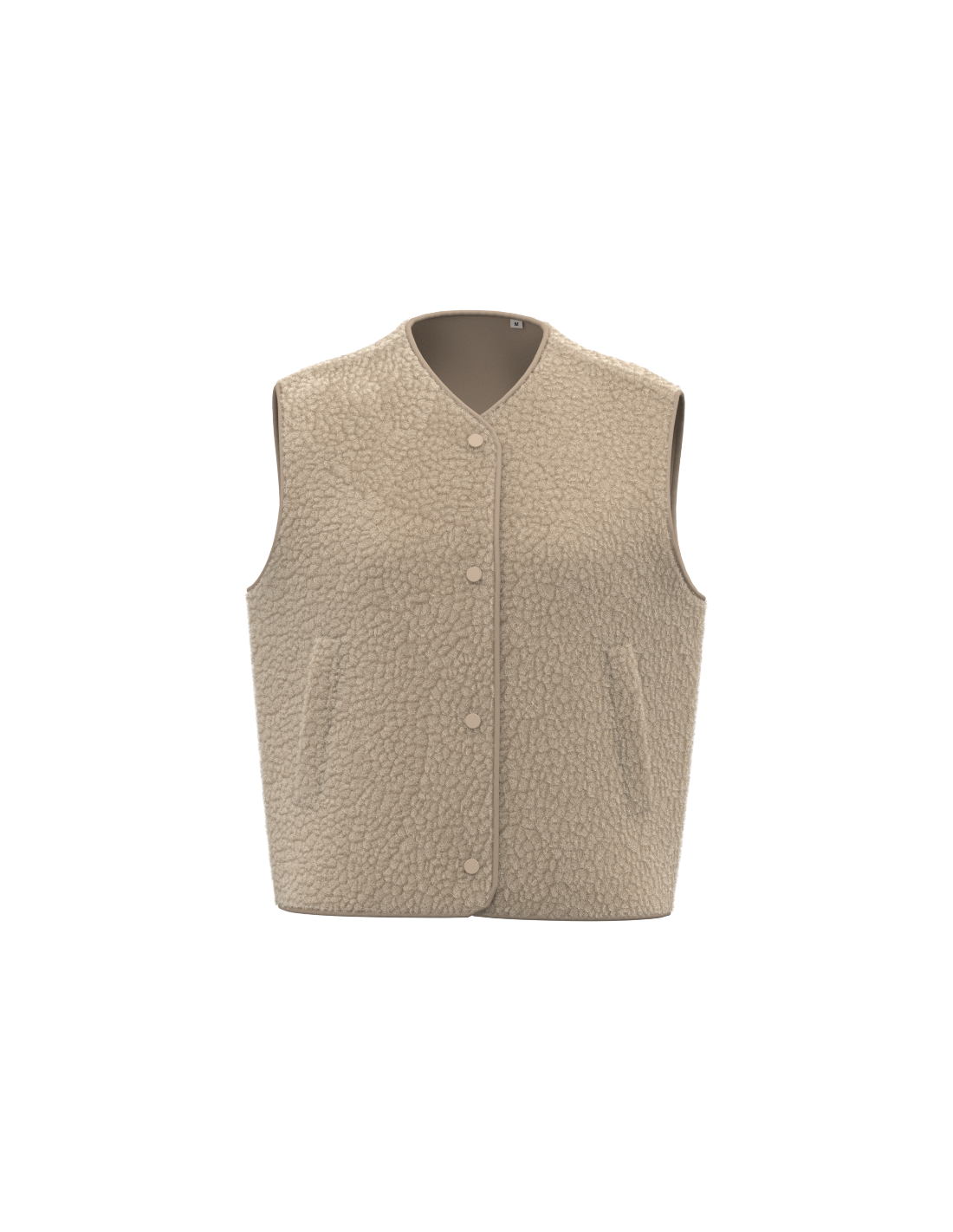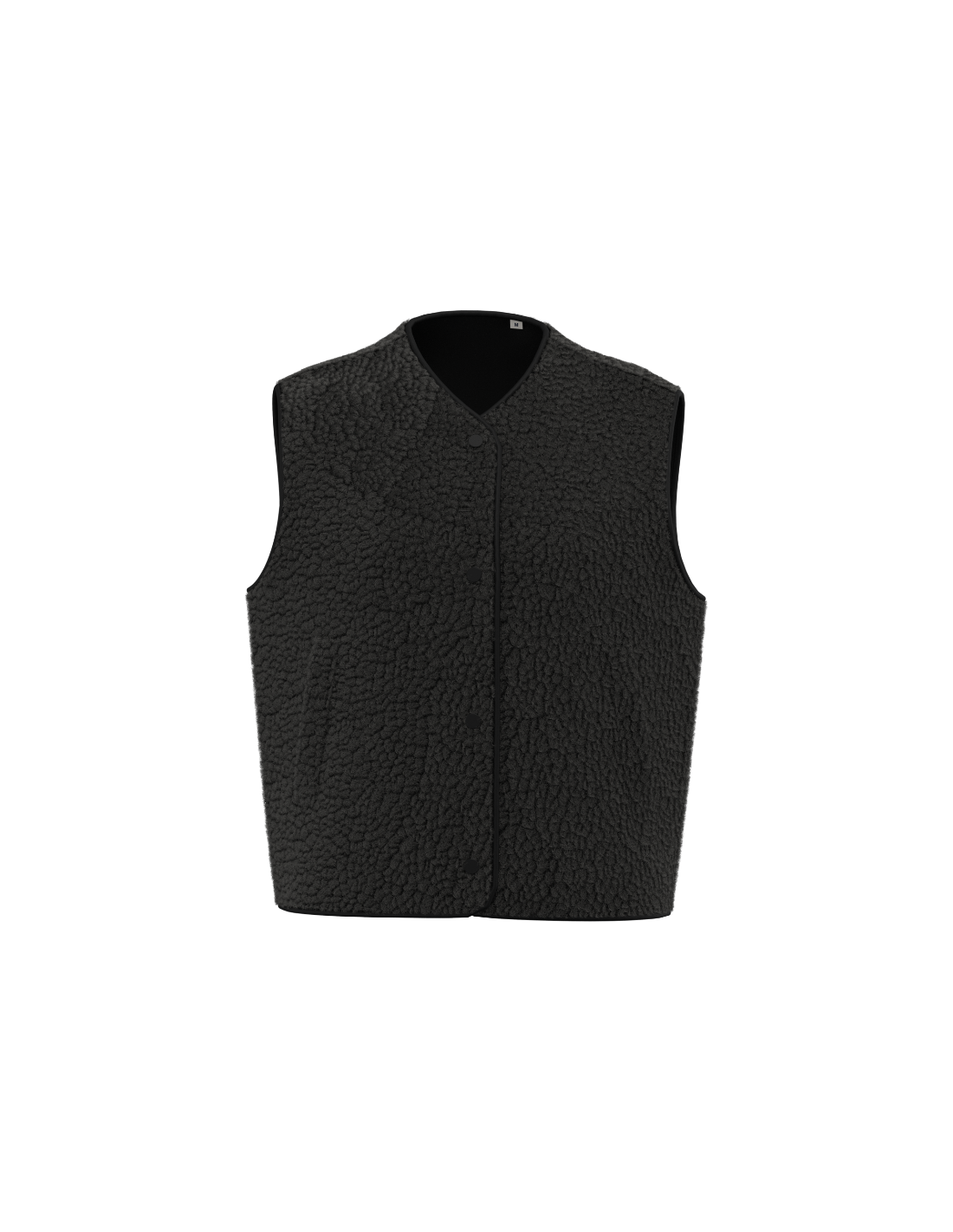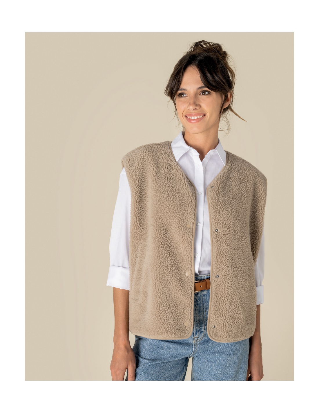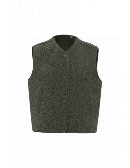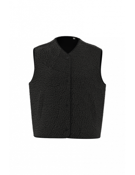 Coupe oversize. Matière en sherpa avec doublure principale en jersey. Fermeture par boutons pressions ton sur ton. Deux poches passepoilées devant. Finition en biais ton sur ton à l’encolure, aux emmanchures, au milieu devant et en bas de vêtement. Zip de personnalisation intérieur en bas de vêtement.
