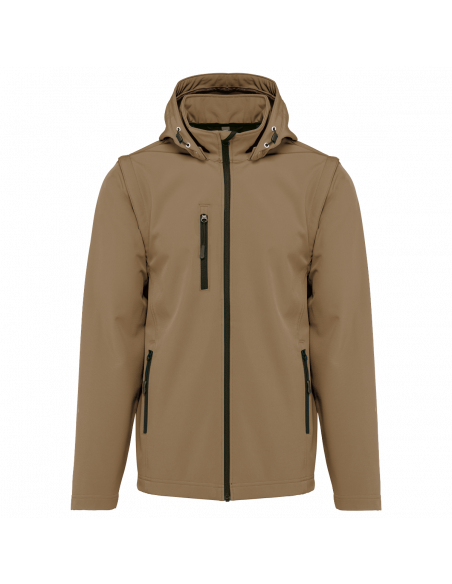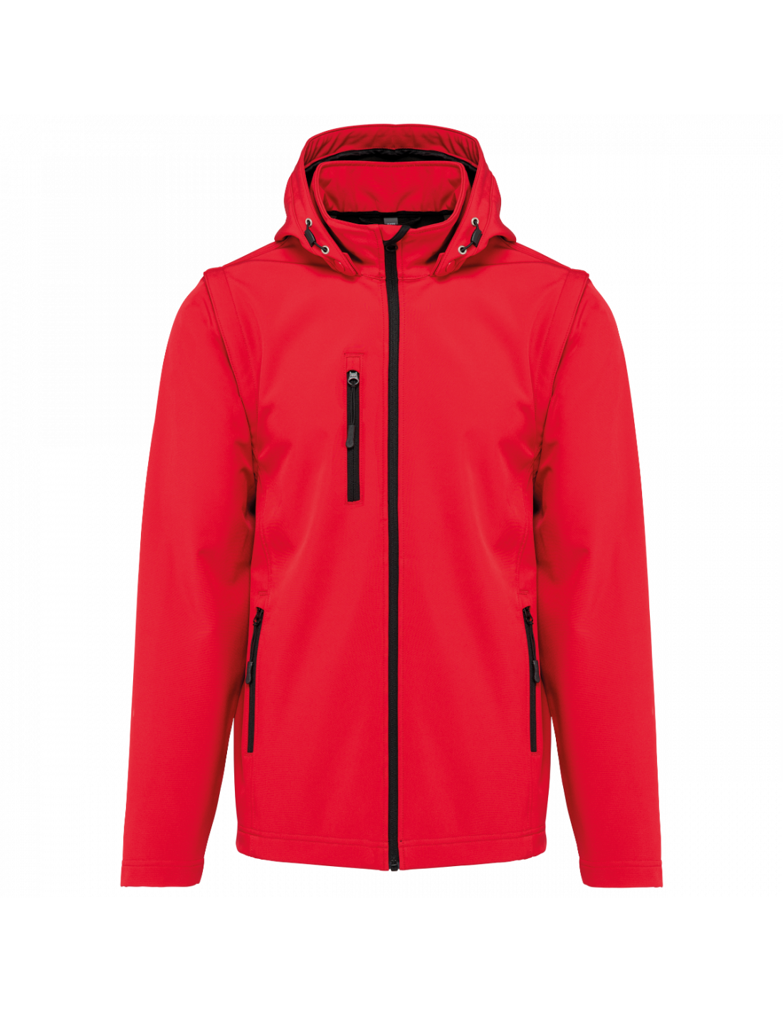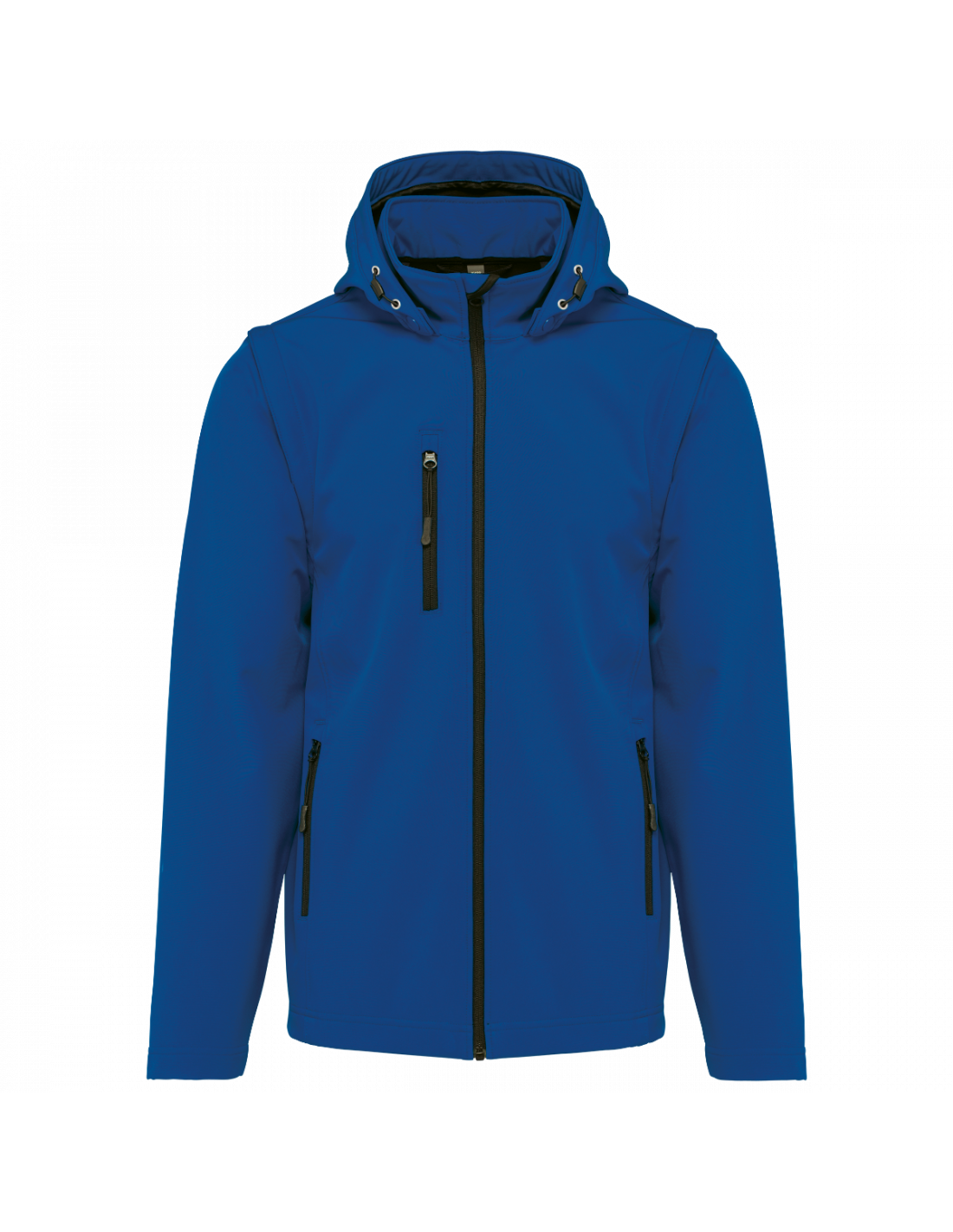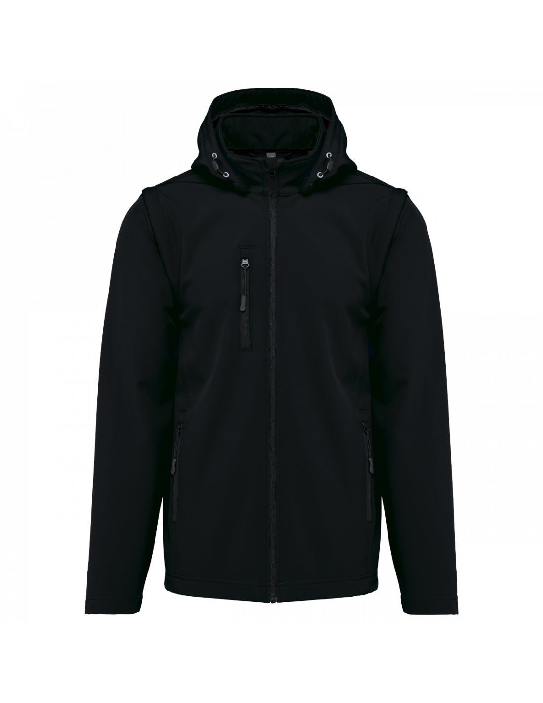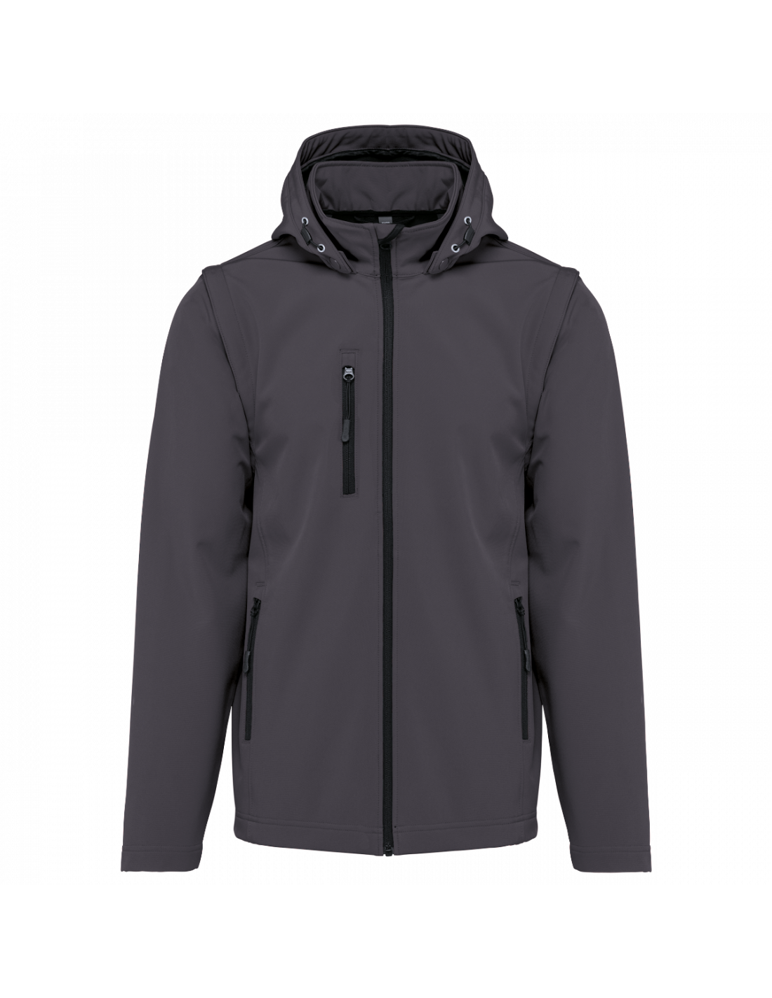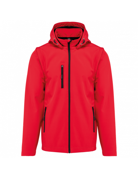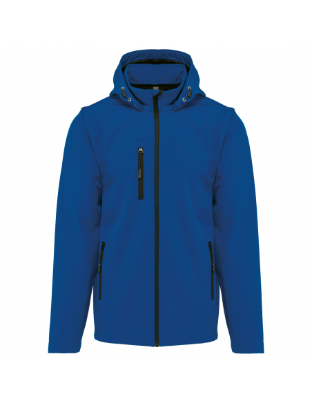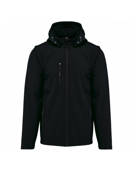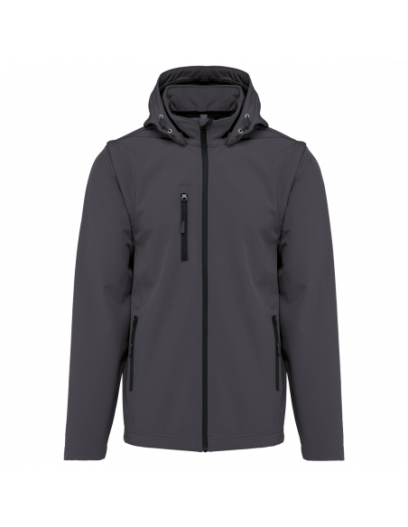 Tissu contrecollé 3 couches respirant. 3000 g/m² /24 h et imperméable 8000 mm. Intermédiaire : membrane respirante. Couche intérieure : micropolaire. Tissu facilitant l'impression. Coupe ajustée. Fermeture zippée. 2 poches zippées sur le devant et une poche zippée devant côté droit au porter. Capuche amovible à l'aide de boutons pression et cordon de serrage. Manches amovibles à l'aide d'un zip. Finition double aiguille au bas de manche et de vêtement.