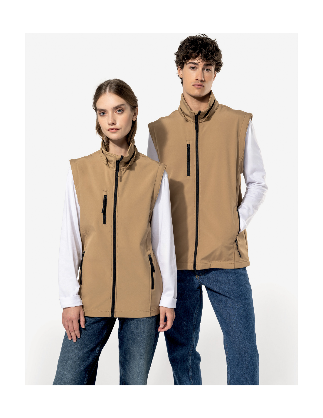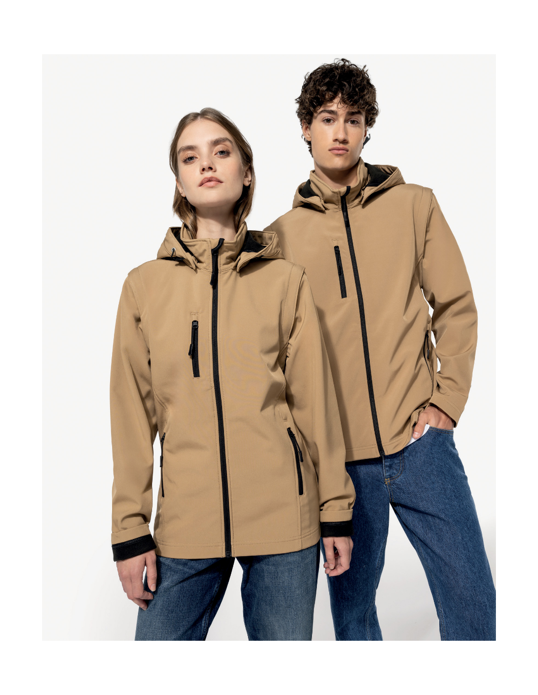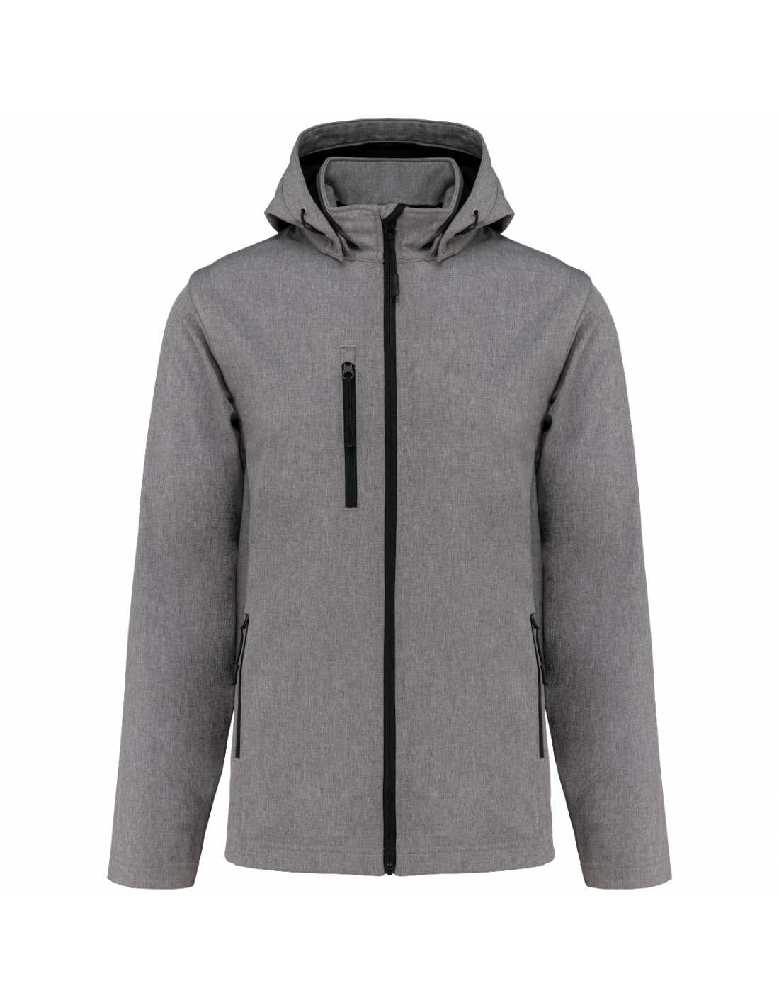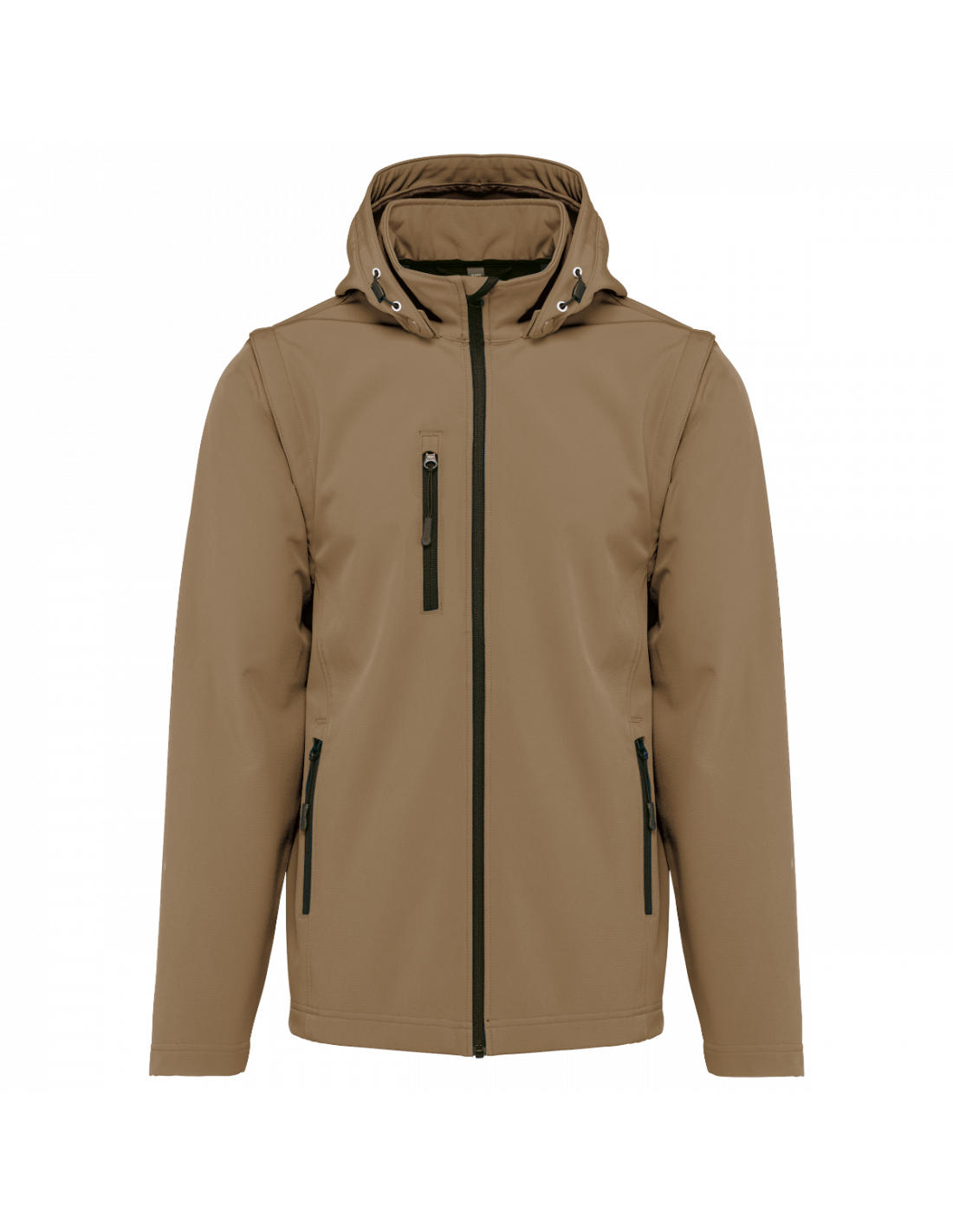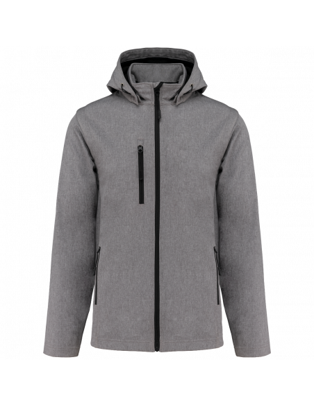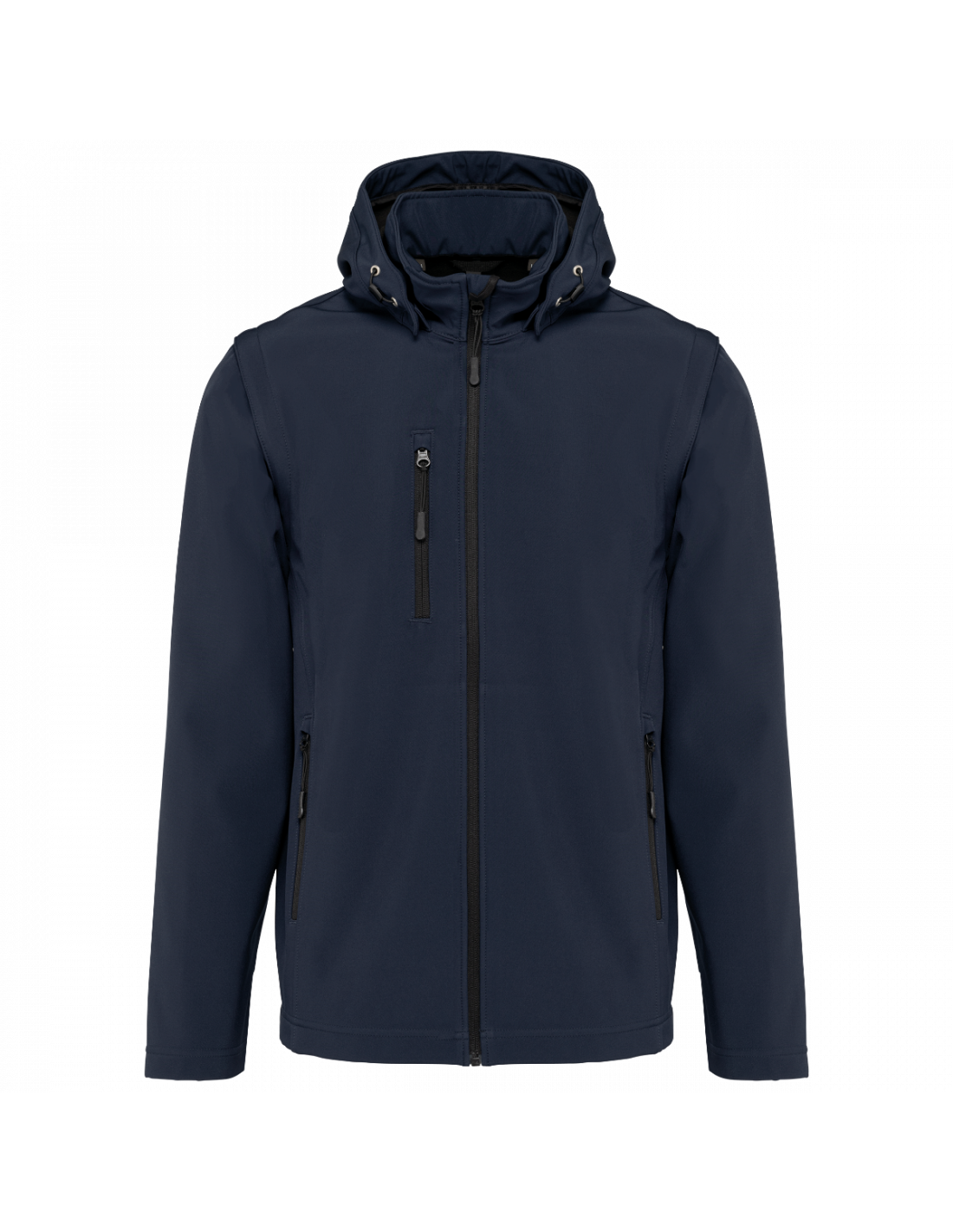 Tissu contrecollé 3 couches respirant. 3000 g/m² /24 h et imperméable 8000 mm. Intermédiaire : membrane respirante. Couche intérieure : micropolaire. Tissu facilitant l'impression. Coupe ajustée. Fermeture zippée. 2 poches zippées sur le devant et une poche zippée devant côté droit au porter. Capuche amovible à l'aide de boutons pression et cordon de serrage. Manches amovibles à l'aide d'un zip. Finition double aiguille au bas de manche et de vêtement.