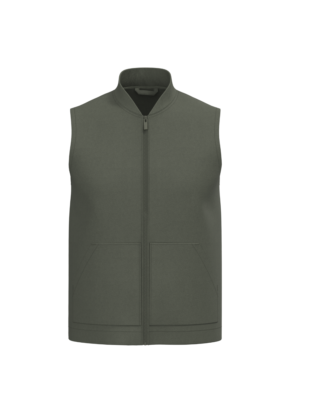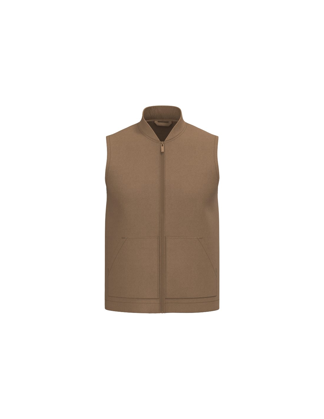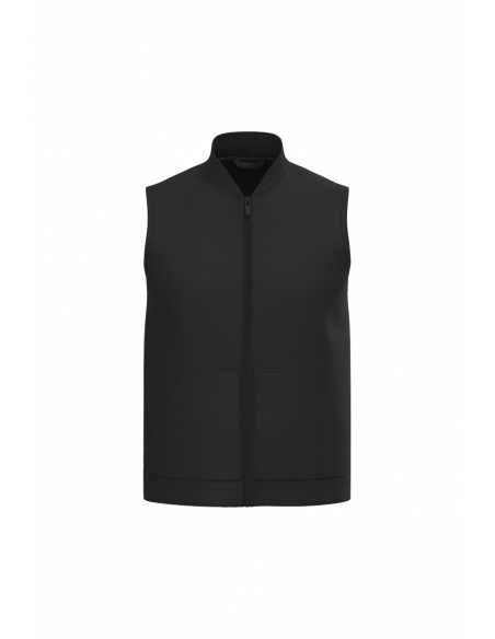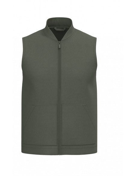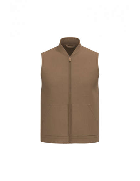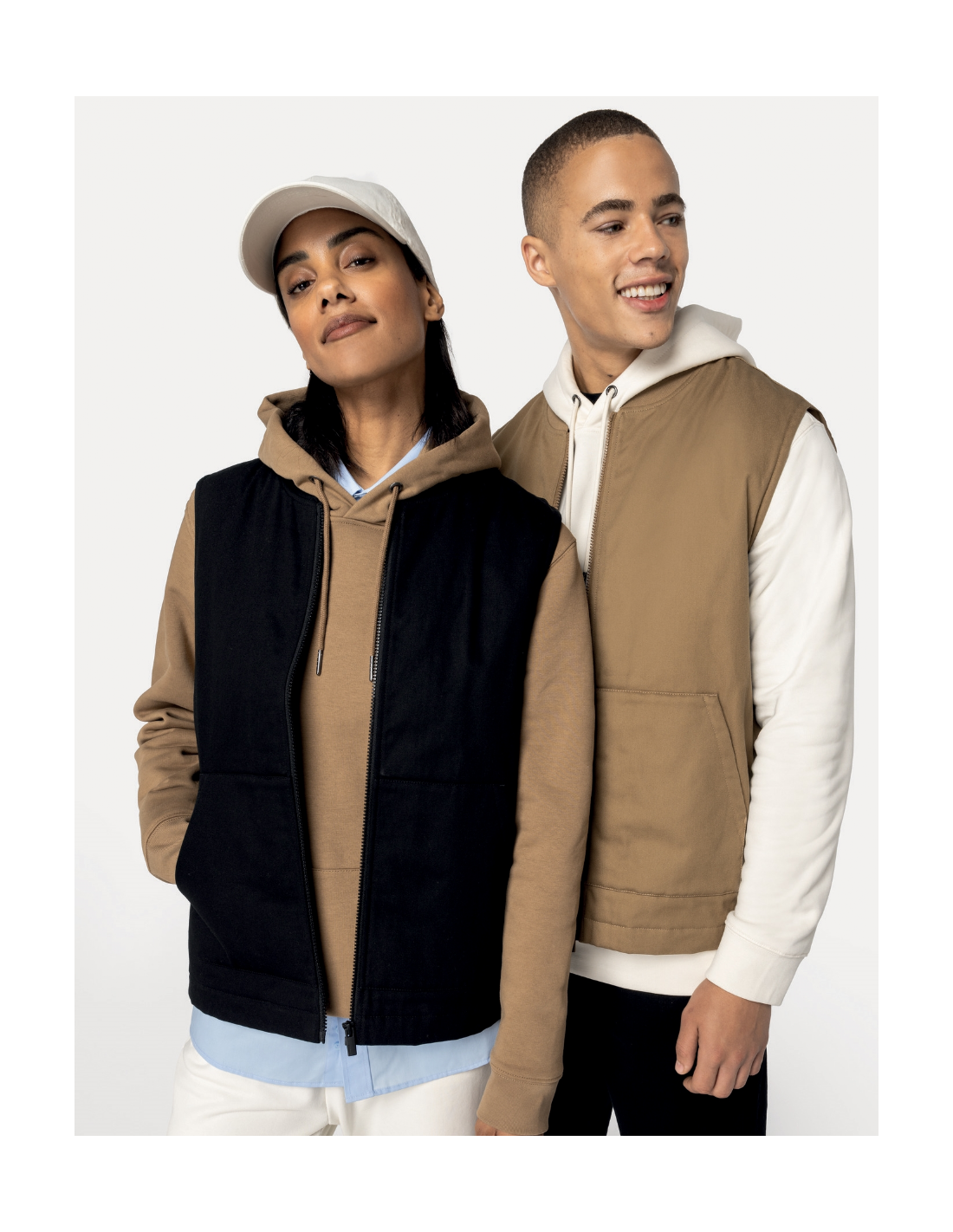 Coupe standard. Tissu en twill. Veste sans manches rembourrée avec polyester recyclé. Col teddy en bord côte 1 x 1. Poche kangourou. Fermeture devant avec zip en plastique et tirette en métal recyclé ton sur ton. Doublure matelassée ton sur ton. Poche intérieure avec velcro, côté droit au porté. Patch de personnalisation en matière principale avec bride de suspension intérieur de vêtement. Zip de personnalisation poitrine et bas de vêtement.
