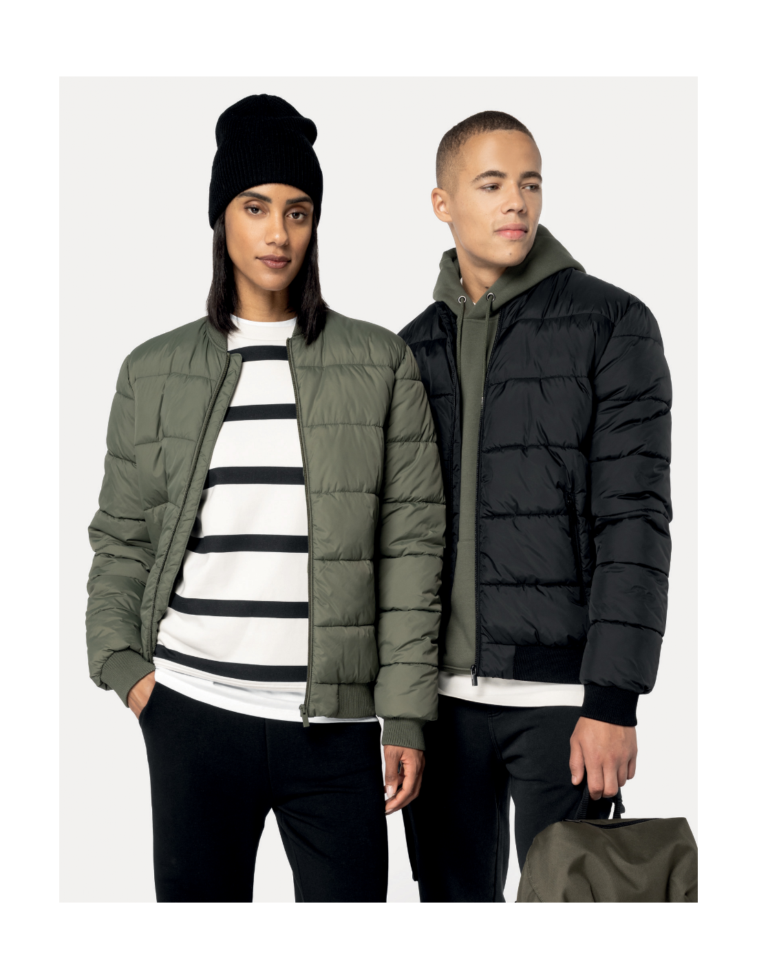 Polyamide pongé. Coupe standard. Construction 300T. Tissu avec enduction. Tissu déperlant niveau 4 et coupe-vent 3 mm/s. Veste matelassée rembourrée en polyester recyclé post-consumer. Col teddy. Bord côte 2 x 2 ton sur ton au col, bas de manches et bas de vêtement. Fermeture zippée milieu devant et poches devant en nylon recyclé avec biais de finition ton sur ton. Poche intérieure passepoilée zippée côté cœur au porté. Patch de personnalisation en matière principale avec bride de suspension à l’intérieur du vêtement. Zip de personnalisation poitrine et bas de vêtement. Aucune surpiqûre sur le haut du devant et du dos pour faciliter la personnalisation.
