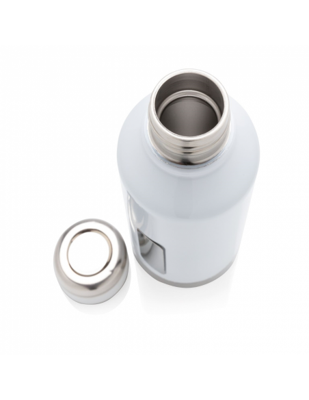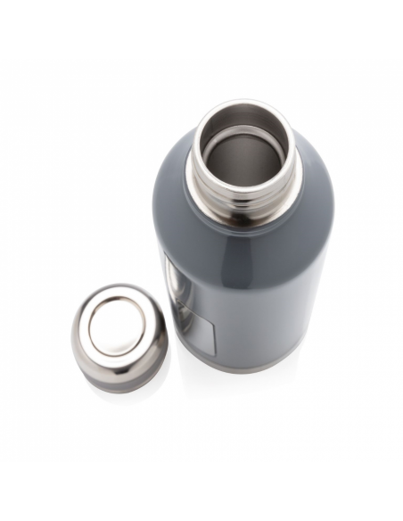 Bouteille étanche 500 ml à double paroi en acier inoxydable, extérieur en 201 et intérieur en 304. Couvercle à visser. Plaque sur le devant de la bouteille pour y mettre le logo. Garde les boissons chaudes 5h et froides 15h.