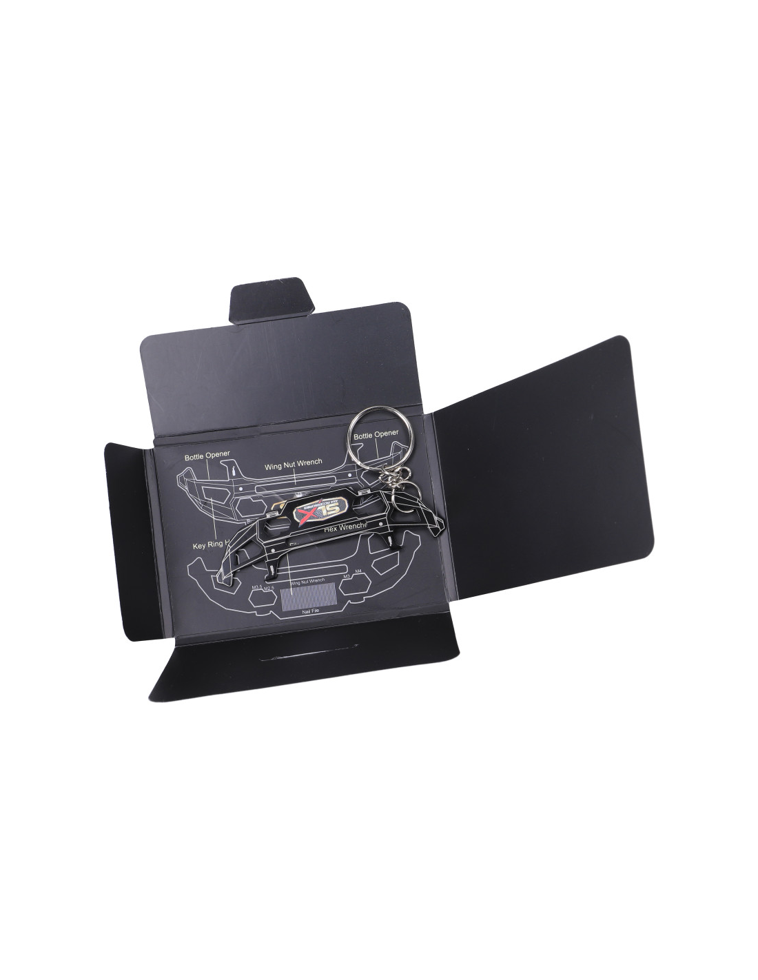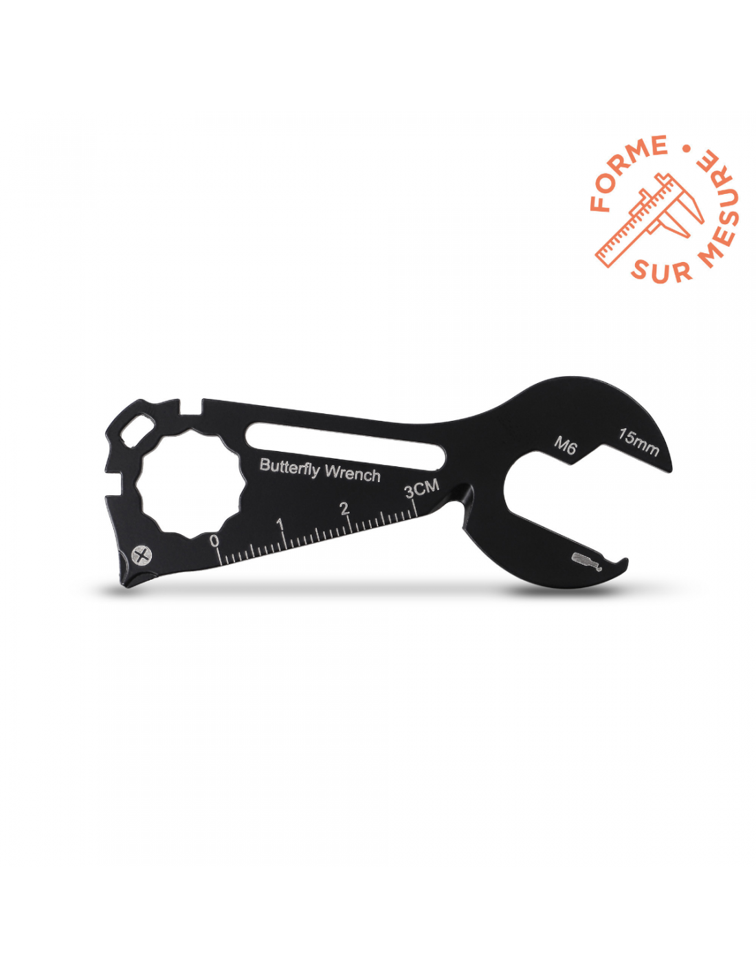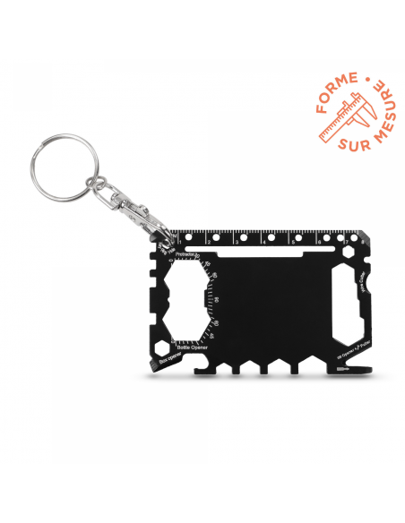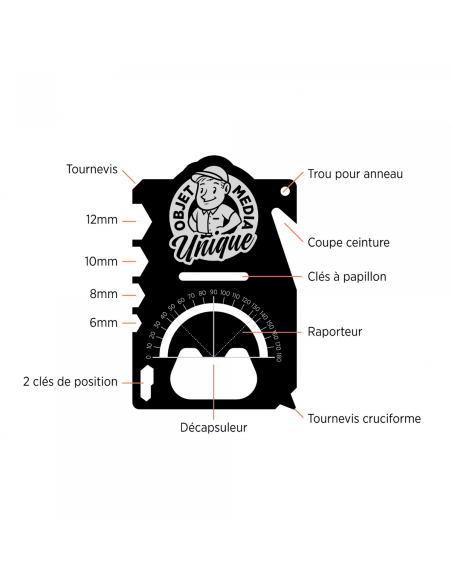 Outil multifonction compact en acier inoxydable, format carte (85x55x1,2 mm).