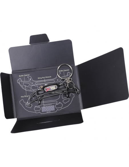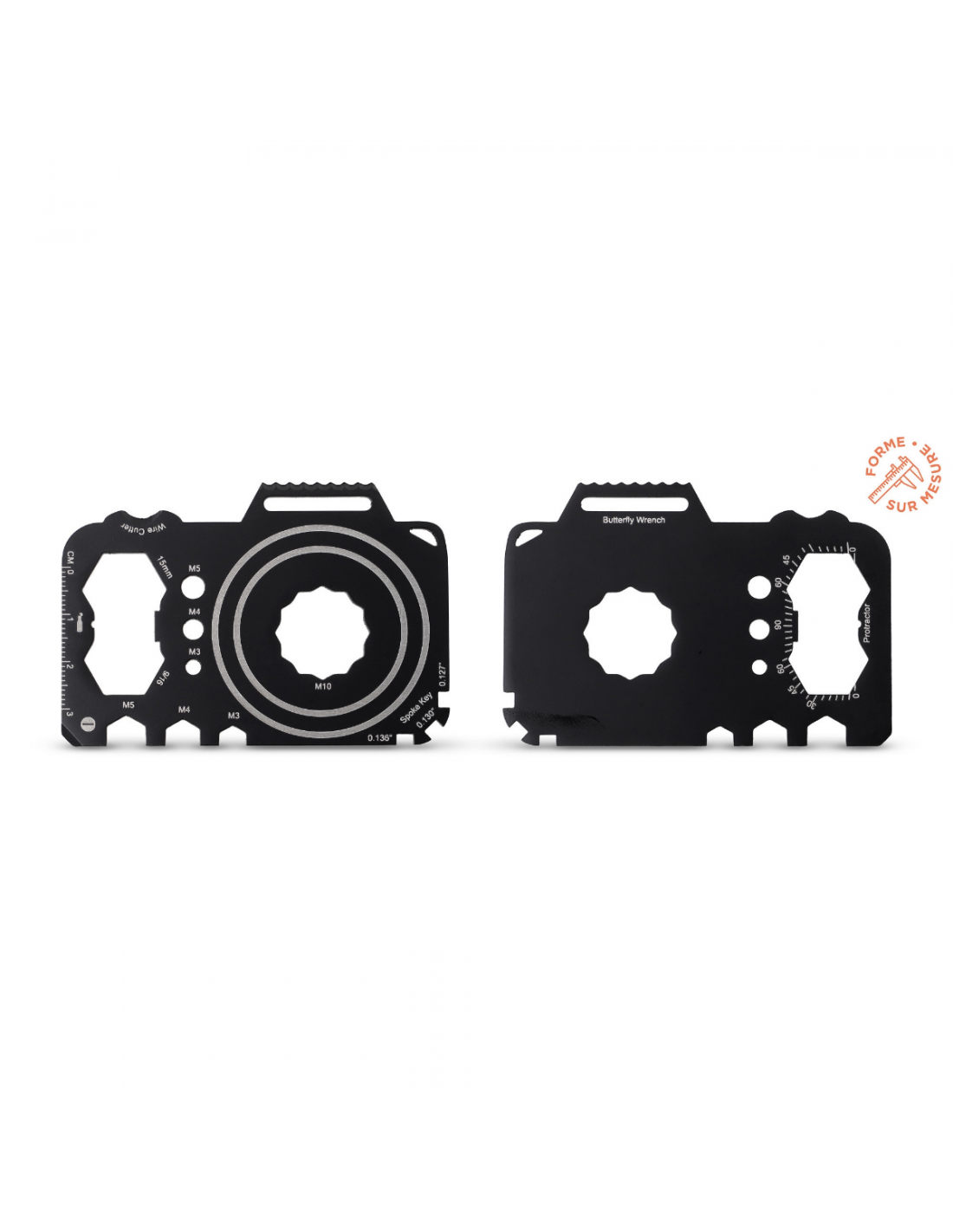 Outil multifonction compact en acier inoxydable, format carte (85x55x1,2 mm).