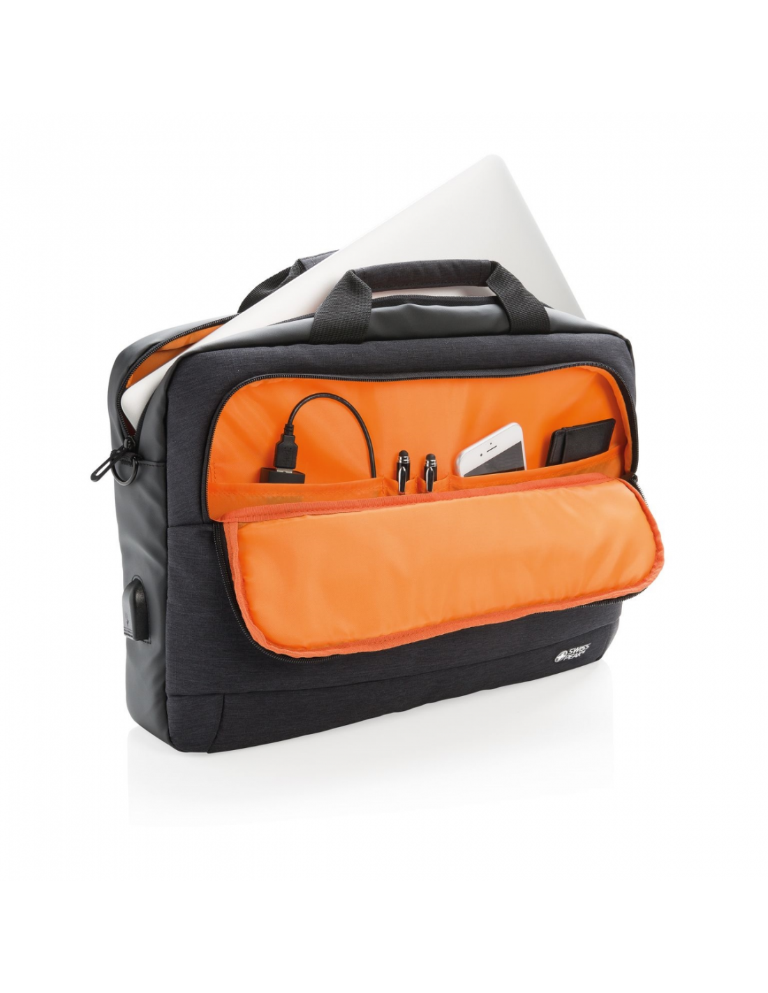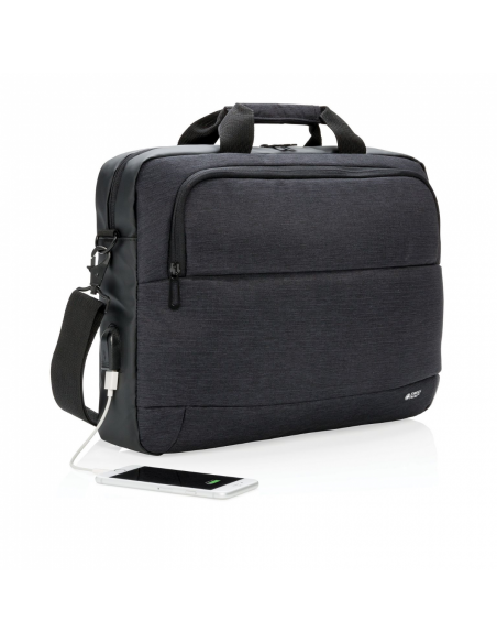 Sacoche pour ordinateur portable 15” en polyester deux couleurs, avec un grand compartiment principal pour votre ordinateur et une poche à l’avant. Branchez aisément votre powerbank sur le port de charge USB intégré et chargez votre téléphone ou tablette pendant vos déplacements. Avec bandoulière et passant trolley à l’arrière.