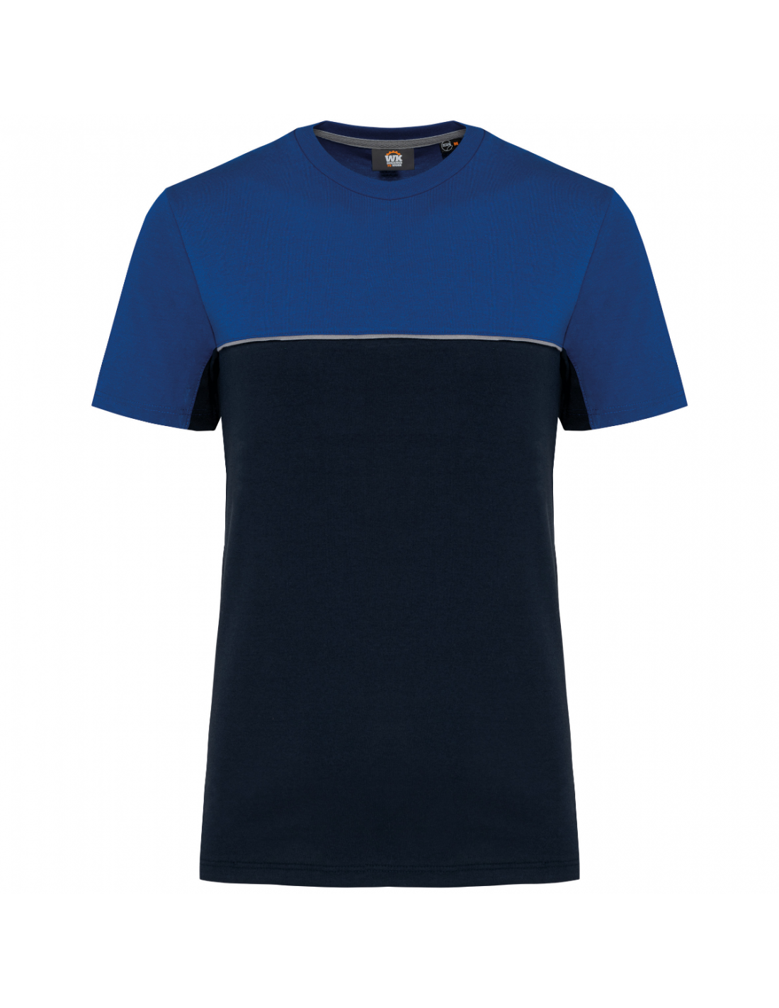 Fil Vortex. Maille jersey. Traitement antiboulochage. Lavable à 60°C. Coupe ajustée. Encolure ronde en bord-côte 1x1 avec élasthanne et bande de propreté contrastée en chevron. Passepoil contrasté entre les parties bicolores du vêtement (corps, devant et dos). Finition double aiguille au bas de manches et de vêtement. Etiquette de marque Tear Away.