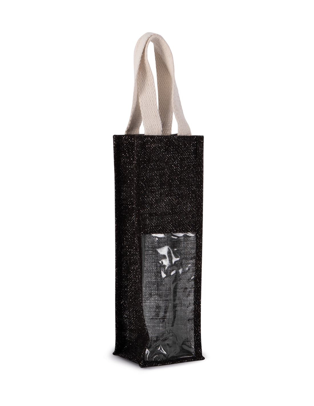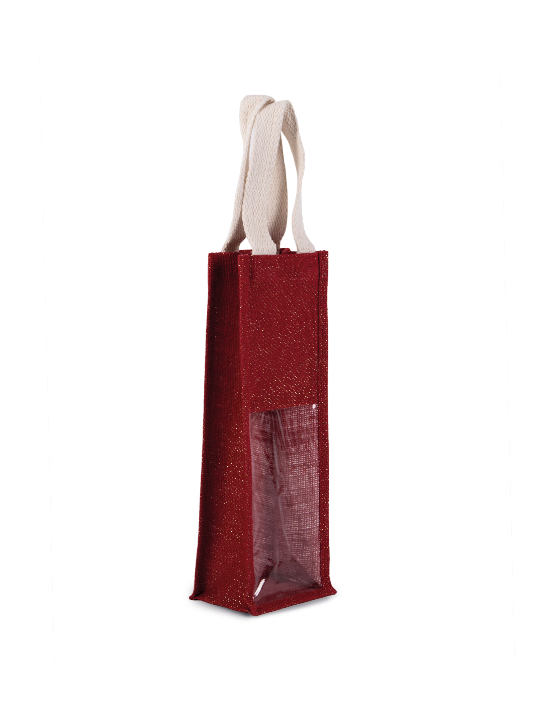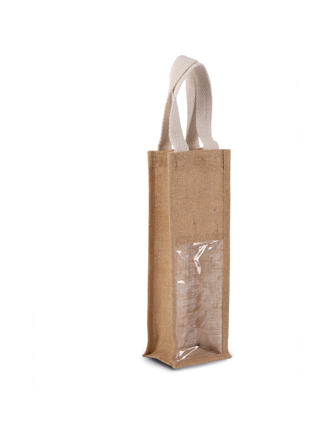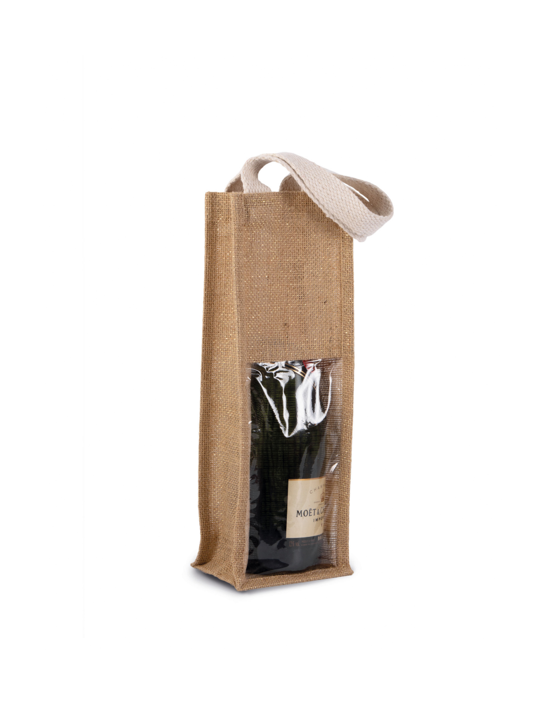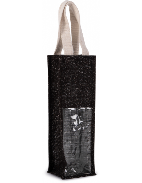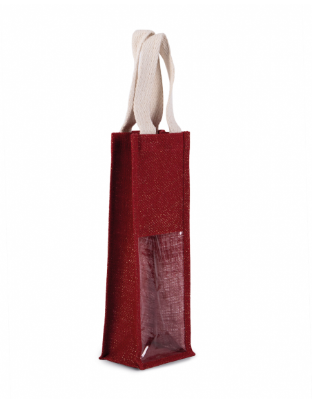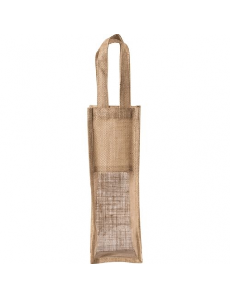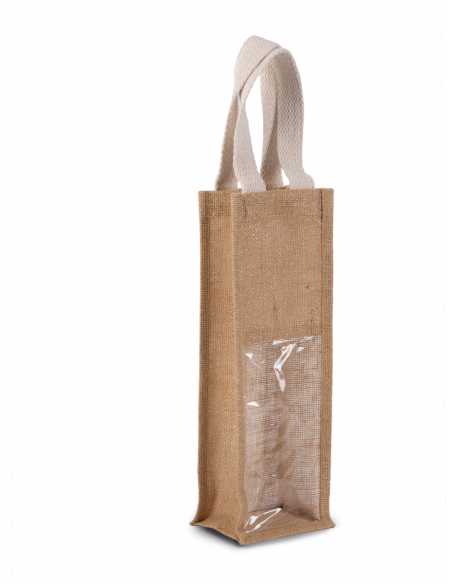 Sac porte-bouteille en toile de jute, avec 2 poignées et fenêtre transparente sur le devant. Conçu pour 1 bouteille.Matière : jute